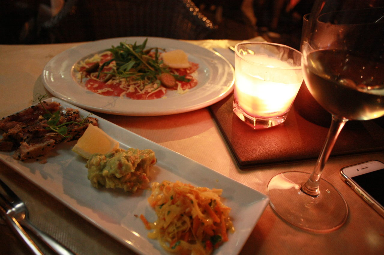 Padimos tartar de atum de entrada, lulas grelhadas de prato principal e, de sobremesa, um mixto de fondant e brownies de chocolate, sorvete de café e marshmellows. Estava superb! Pra acompanhar, vinho branco sul-africano! O único problema que achei dos vinhos brancos em todos os restaurantes que fui foi a temperatura. Eles não são servidos tão gelados como deveriam (ou como eu gostaria) e a gente acaba tendo que colocar umas pedras de gelo na taça!