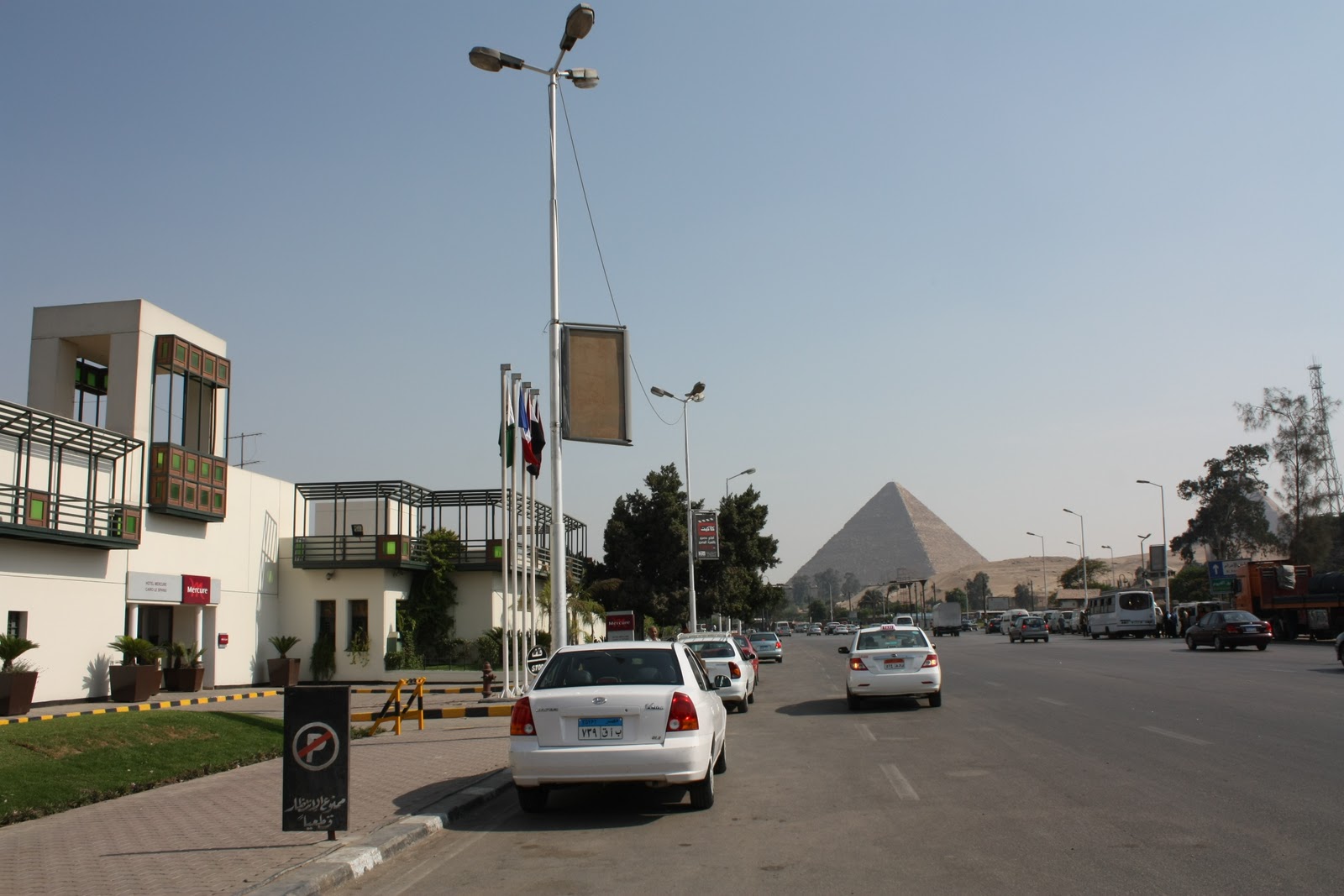 Quase 1 hora depois, chegamos ao nosso hotel, que tem raio-X na entrada, o que é comum em na maioria dos estabelecimentos públicos do Cairo. Ficamos hospedadas no Mercure Cairo LeSphinx, um 5 estrelas com vista para as pirâmides. Escolher um hotel no Cairo foi um tanto quanto complicado. A princípio íamos reservar estes hotéis bbb no centro da cidade, pra ficarmos bem próximos da cultura local, sem ficarmos presos em hotéis cheios de frescuras, onde o contato com outras pessoas é quase zero, mas aí, estudando um pouco mais, vi que por ser o Egito um país tão complicado, onde alguns hotéis reaproveitam até o resto de suco dos outros (sim, me contaram isso), decidimos não passar perrengues à toa, até porque hotéis 5 estrelas no Cairo têm preços bem atrativos. Além do mais, a vista do hotel para as pirâmides encheram meus olhos e não pensei no ponto negativo deste hotel: a distância em relação ao centro. Se fosse só pela distância, esta não era tão grande, só 18 km. O que são 18 km numa cidade grande como o Cairo? Nada!Se você considerar que o táxi é muito barato, não seria o problema. O que eu esqueci de considerar foi o trânsito infernal que pegaríamos para fazer estes 18 km, o que deixava qualquer ser humano irritado, naquele calor de matar, naqueles táxis caindo aos pedaços e sem ar que a gente pegava pela rua. Faz parte do aprendizado passar estes perrengues! Por sorte, acabamos pegando um feriado e a sexta-feira no Cairo, que é dia de folga dos muçulmanos e não pegamos quase nenhum trânsito nos dias seguintes. Por outro lado, demos azar porque o comércio ficava fechado. Então, no frigir dos ovos, eu acho que o hotel acabou valendo a pena!