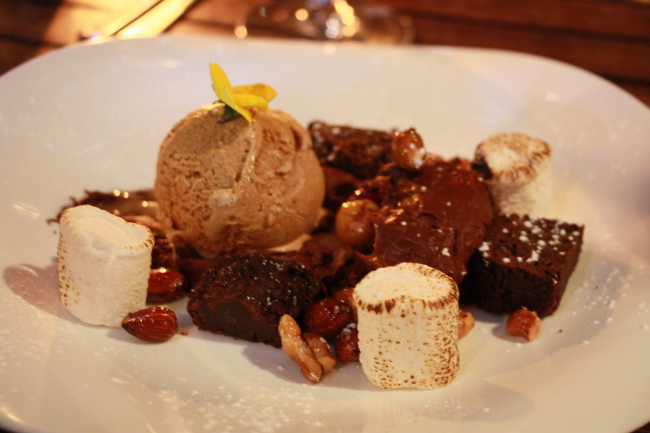 Padimos tartar de atum de entrada, lulas grelhadas de prato principal e, de sobremesa, um mixto de fondant e brownies de chocolate, sorvete de café e marshmellows. Estava superb! Pra acompanhar, vinho branco sul-africano! O único problema que achei dos vinhos brancos em todos os restaurantes que fui foi a temperatura. Eles não são servidos tão gelados como deveriam (ou como eu gostaria) e a gente acaba tendo que colocar umas pedras de gelo na taça!