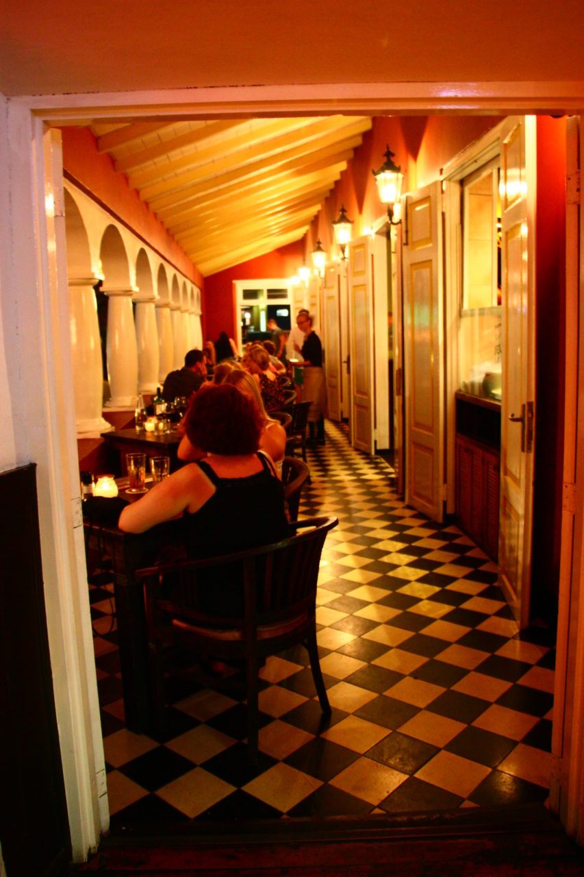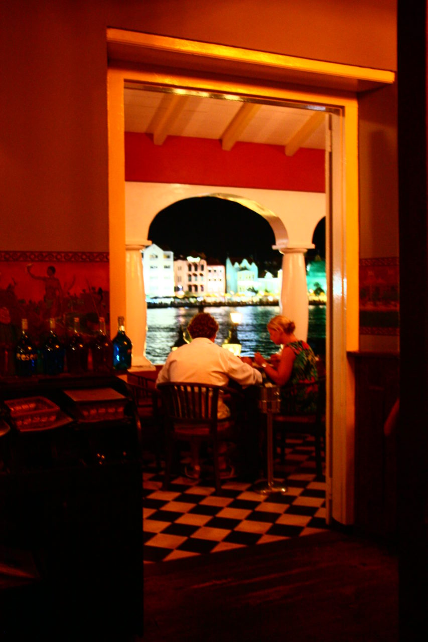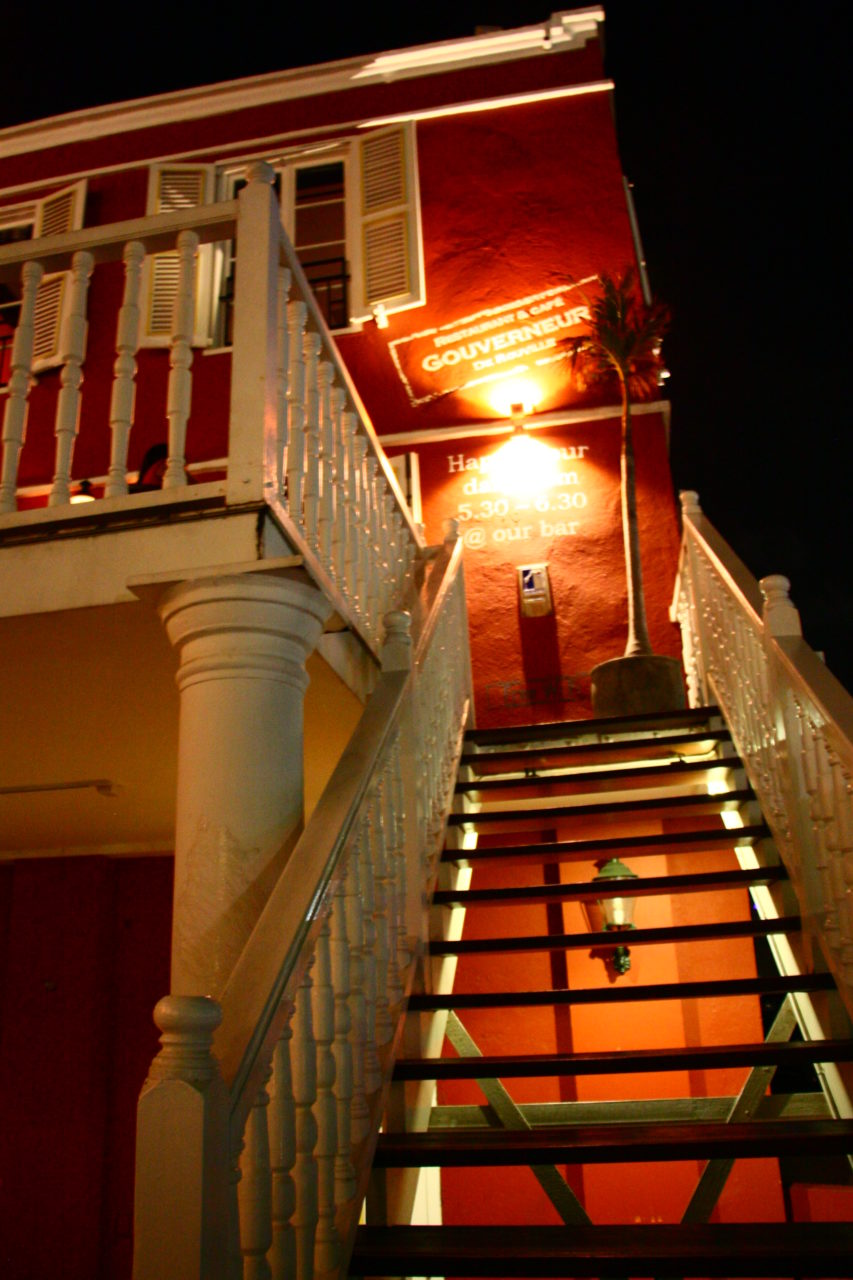 Havia lido alguns blogs de viagem que citavam o Restaurante & Cafe Gouverneur de Rouville como um dos melhores e mais clássicos da ilha, além de lindo, romântico e com uma localização privilegiada em Otrobanda, com vista para as casinhas coloridas de Punda, e foi este que resolvi experimentar na nossa noite especial e fiz reserva meses antes pelo site do hotel.