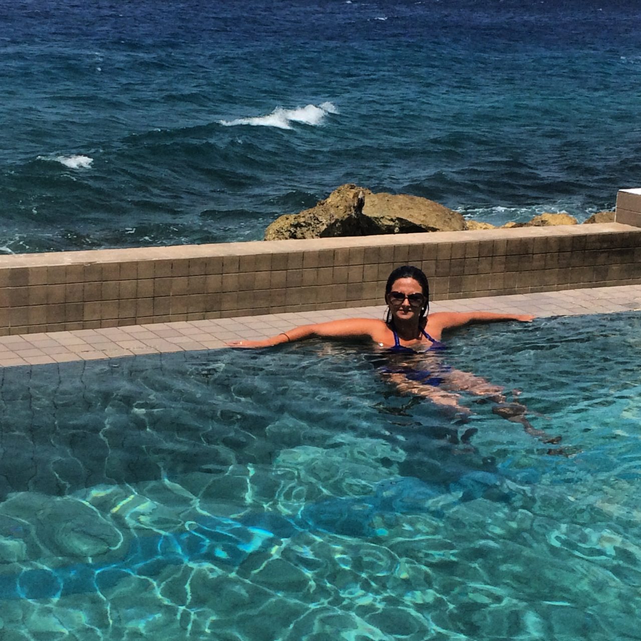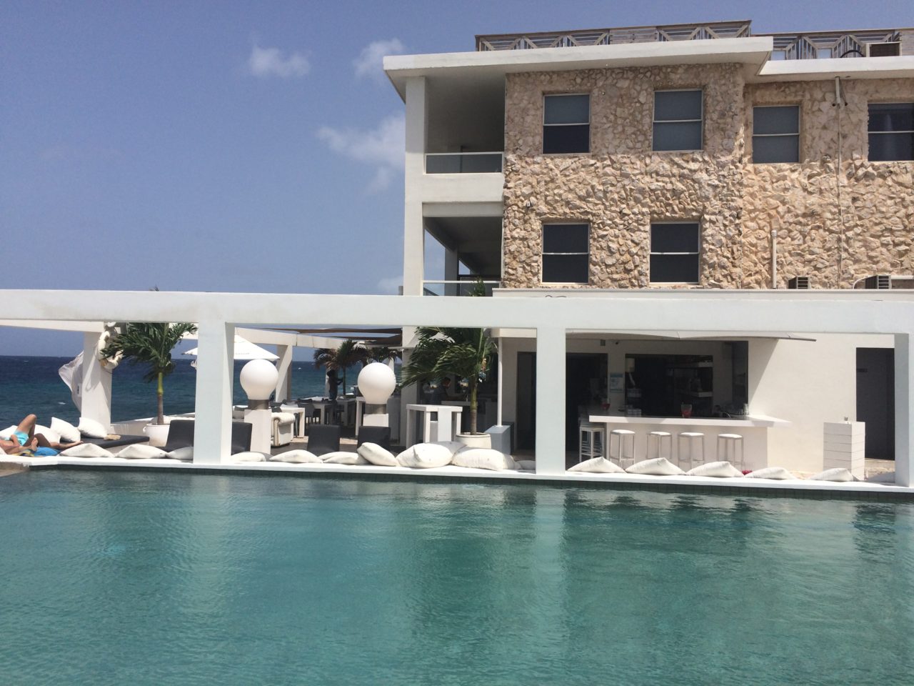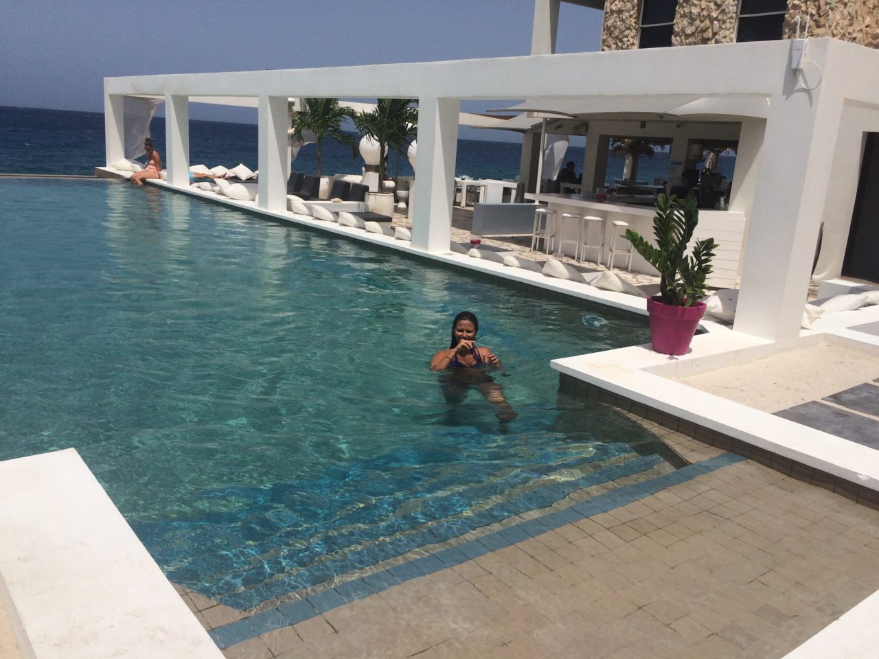 Ahhhh, este é o maior atrativo do hotel: a piscina de borda infinita, no meio de uma decoração branca e rosa linda de doer! Confesso que pouco fiquei ali, pois com as praias paradisíacas que Curaçao tem, era difícil ficar só na piscina, então eu curti mais no dia de ir embora e na tarde anterior! Faltou um dia a mais em Curaçao, pra aproveitar mais o hotel e voltar a algumas praias que amamos!