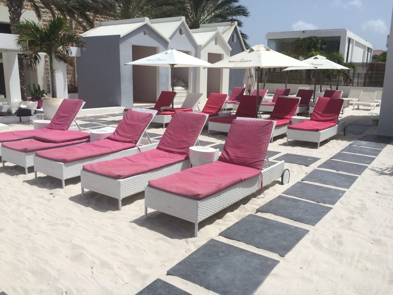 O piso da área da piscina é de areia braquinha e parece mesmo que estamos na praia (e na verdade estamos, com aquele mar na nossa frente).