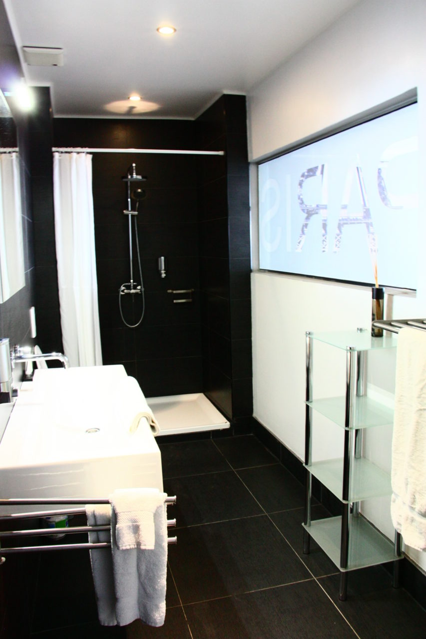 Os quartos do Saint Tropez são maravilhosos, enormes e com uma decoração moderna e clean! Nós ficamos na Suite Paris e , como podem imaginar, a decoração remetia à Cidade-Luz, com um lindo papel de parede com a bela imagem da Torre Eiffel. Além disso, era tudo preto e branco e foi perfeito!