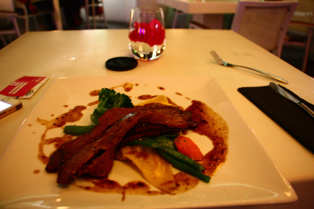 De entrada escolhi um tartar de salmão; de prato principal, carne e de sobremesa, uma torta de morango.