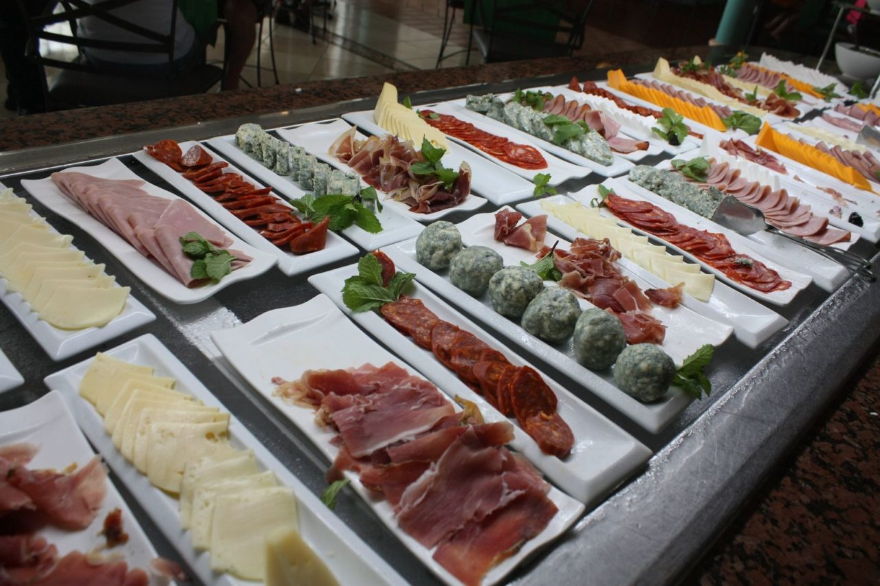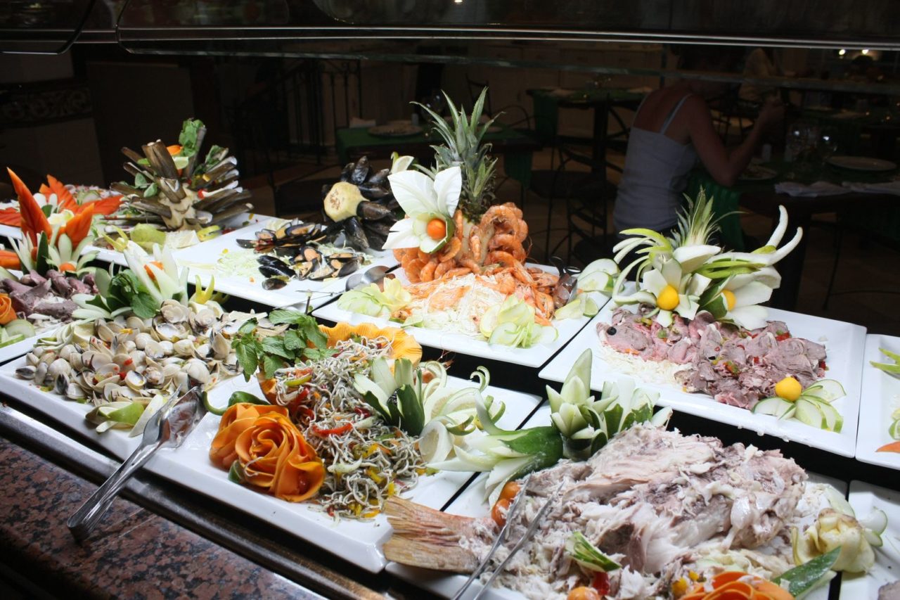- ao estilo buffet, onde era servido o café da manhã diariamente, almoço e jantar, com muitas opções de saladas, carnes, frutos do mar, massas e sobremesas