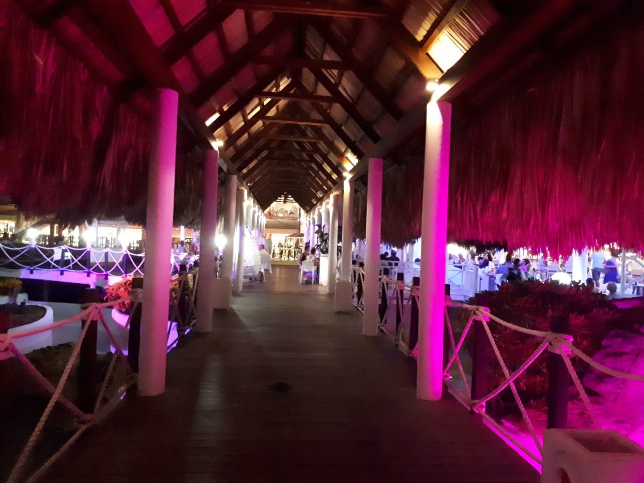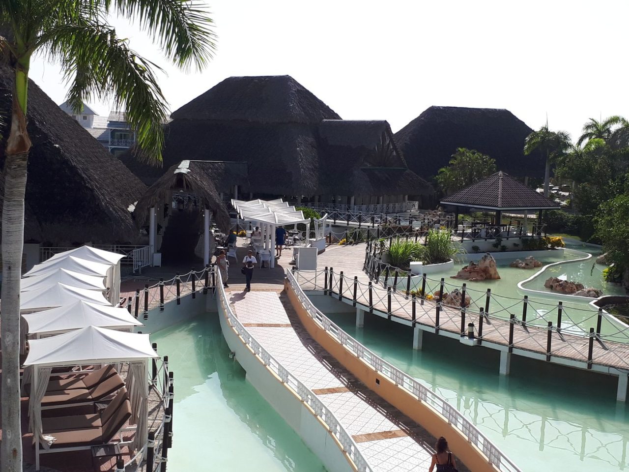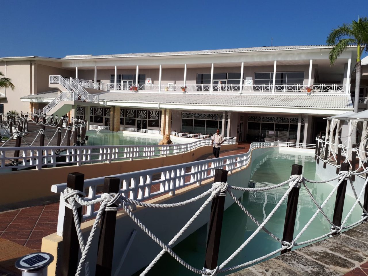O hotel é bem caribenho, com os prédios dos quartos todos coloridos ligados por pontes de madeira com cordas. Muito lindo.