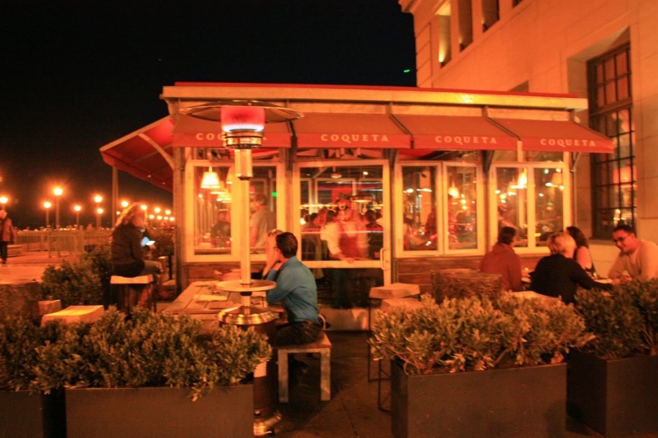O Coqueta é um bar / restaurante espanhol, super descolado, localizado no Embarcadero, em San Francisco. Além da área do bar em si, com balcão e mesinhas mais altas tanto na parte interna quanto externa, tem uma outra área enorme com cara de restaurante informal, mas super arrumado ao mesmo tempo! O bar é um dos hot spots da cidade e está sempre muito movimentado. Além do mas é lindo e fica numa área privilegiada da cidade: no famoso Pier 5, de frente pra Baía de São Francisco.