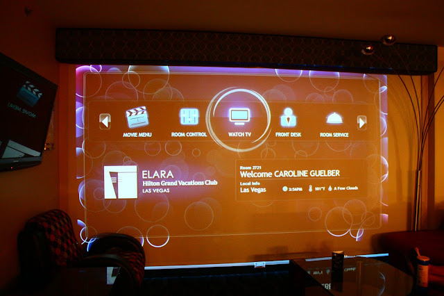 Uma TV estava bem ali, mas também em outros 4 lugares da suíte. Tinha mais TV naquele quarto do que gente pra assisti-las. Uma na cozinha, uma na sala, uma no quarto, uma no banheiro e, pasmem, um big telão quando baixávamos a cortina da janela! Luxo total!!! O banheiro era amplo, com amenidades de ótima qualidade e uma máquina de lavar/secar roupas embutida! hahaha Voltamos com a roupa toda lavada pro Brasil!!!