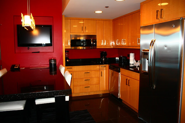 A suíte conta com uma cozinha ótima com tudo que temos direito: cafeteira, micro-ondas, lava-louças, talheres, louças e taças e uma big geladeira inox side by side. Tem ainda uma mesa com 4 cadeiras onde desfrutávamos de nosso belo café da manhã, preparado por nós mesmos. Eu adoro, porque assim dá tempo de experimentar várias guloseimas diferentes que vimos nos supermercados americanos.
