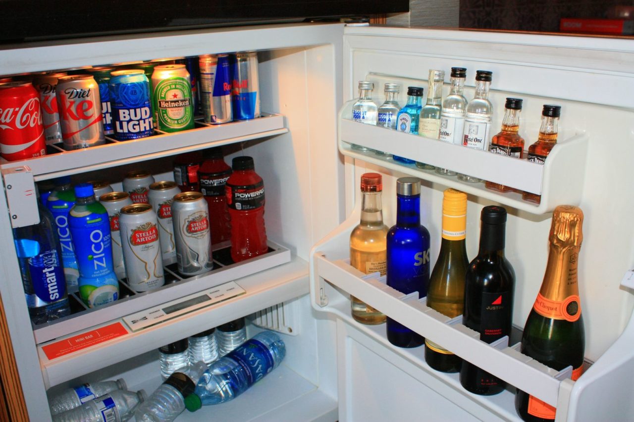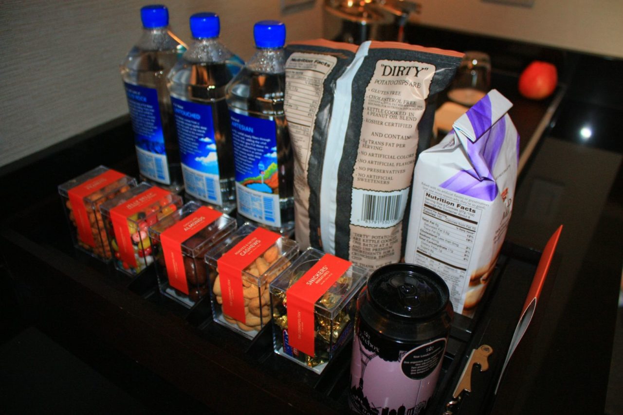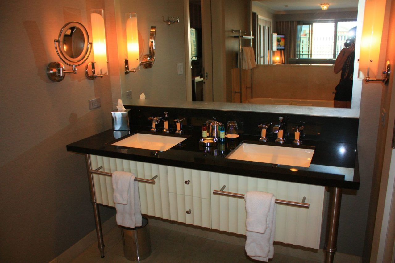 No nosso caso, ficamos na Terrace Studio Fountain View, uma suíte extremamente ampla, moderna, lindamente decorada, com uma cama king, armários embutidos, sala de estar e até uma mini cozinha, com pia, cafeteira, micro-ondas, min bar, taças/xícaras, maquina de café e frigobar, que era daqueles que a gente retira algo e imediatamente já é taxado! #Medo rs.