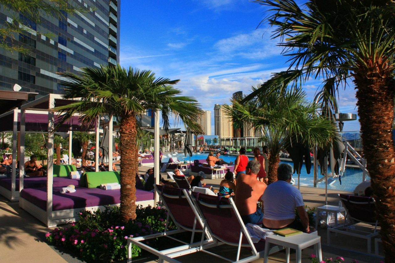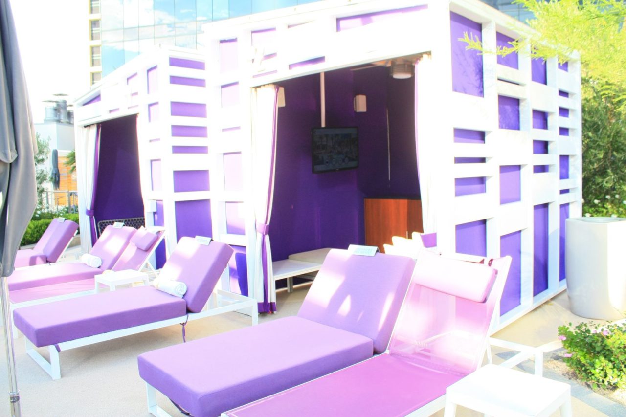 A piscina do The Cosmopolitan é linda, com várias espreguiçadeiras nos tons de roxo e branca, um charme! Há 2 piscinas, sendo uma delas, a menor, de água quente e com hidro.