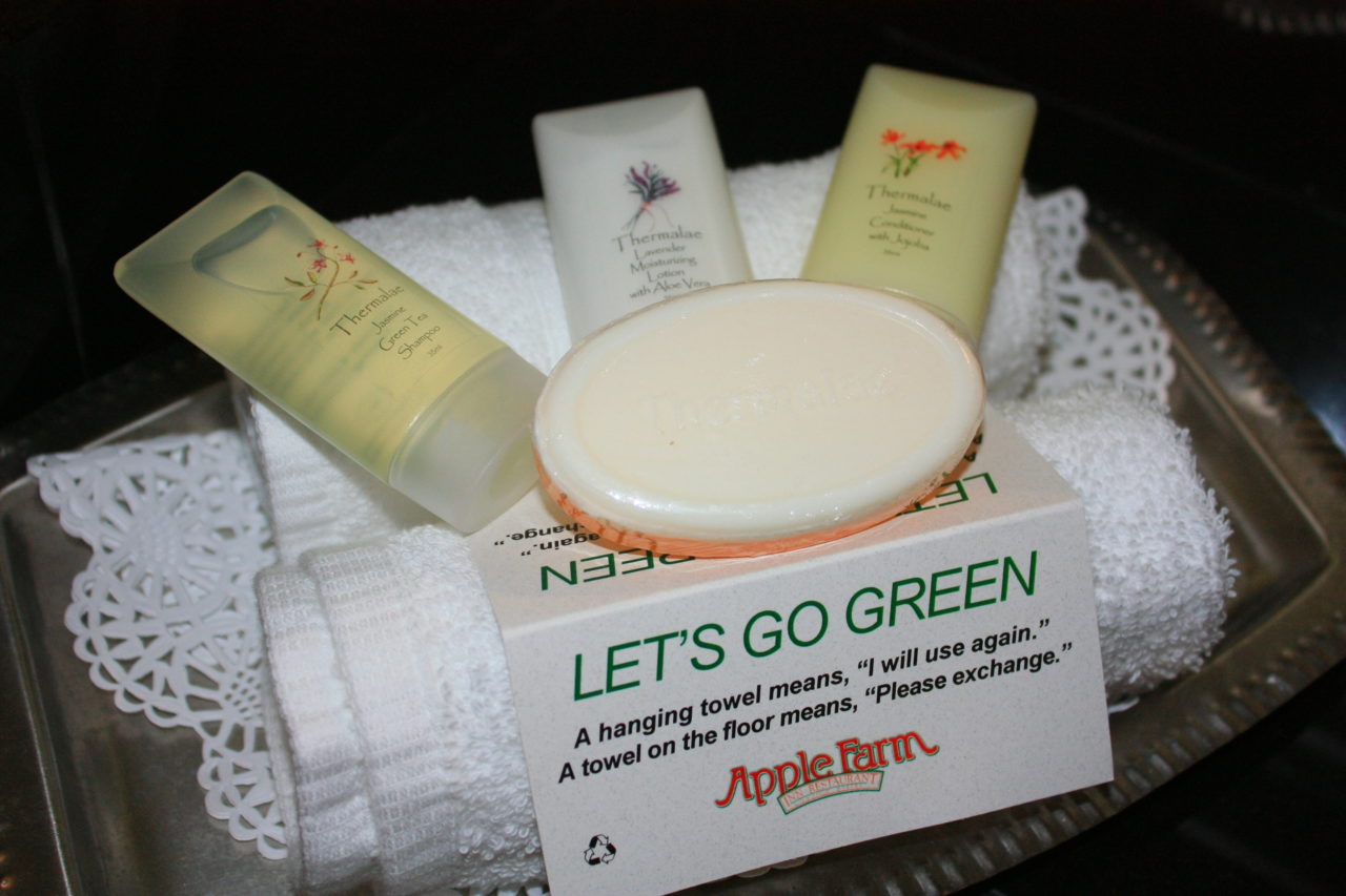Como cortesia, ainda tinha suquinhos de maçã e cookies com gotas de chocolate, além de um voucher de 5 USD para ser gasto na padaria local – sim, tem uma padaria completa dentro do hotel – com cada coisa maravilhosa! Usei meus créditos para comprar o mesmo cookie que ganhamos quando fizemos nosso check-in, de tão deliciosos que eram. Acho que nunca comi um tão bom! E uma cosa muito bacana é que se você ajudar o meio ambiente e não pedir para trocar as toalhas, você ganha estes créditos todos os dias. Demais, né?
