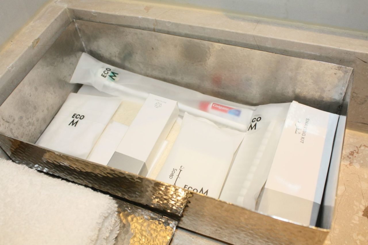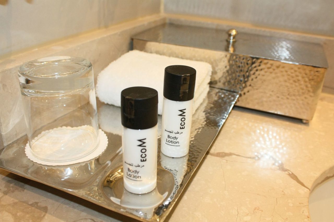 O banheiro, embora pequeno, tinha banheira de hidromassagem e todas as amenidades lindamente dispostas em caixas metálicas luxuosas, bem a cara do mundo árabe!
