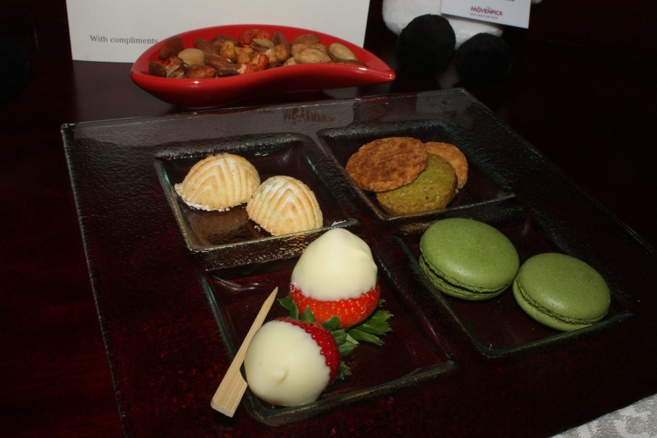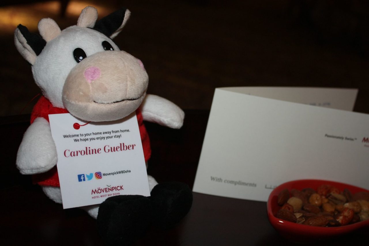 Quando chegamos ainda fomos recebidos com mimos no quarto, como as vaquinhas símbolos da rede Movenpick, docinhos e frutas secas! Que capricho!