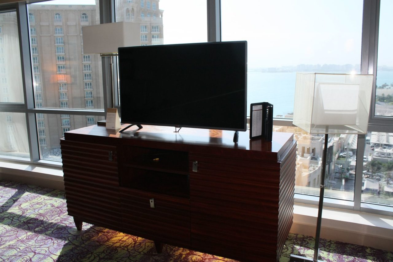 O nosso quarto no Movenpick Hotel West Bay Doha era gigantesco, uma suíte composta com uma sala de estar enorme equipada com mini cozinha, frigobar, cafeteria Nespresso, TV, escrivaninha e até um lavabo! Uma das paredes era tomada por enormes janelões de vidro que iam do chão ao teto e proporcionavam uma vista 180 graus do Golfo Árabe e dos modernos edifícios da área de West Bay.