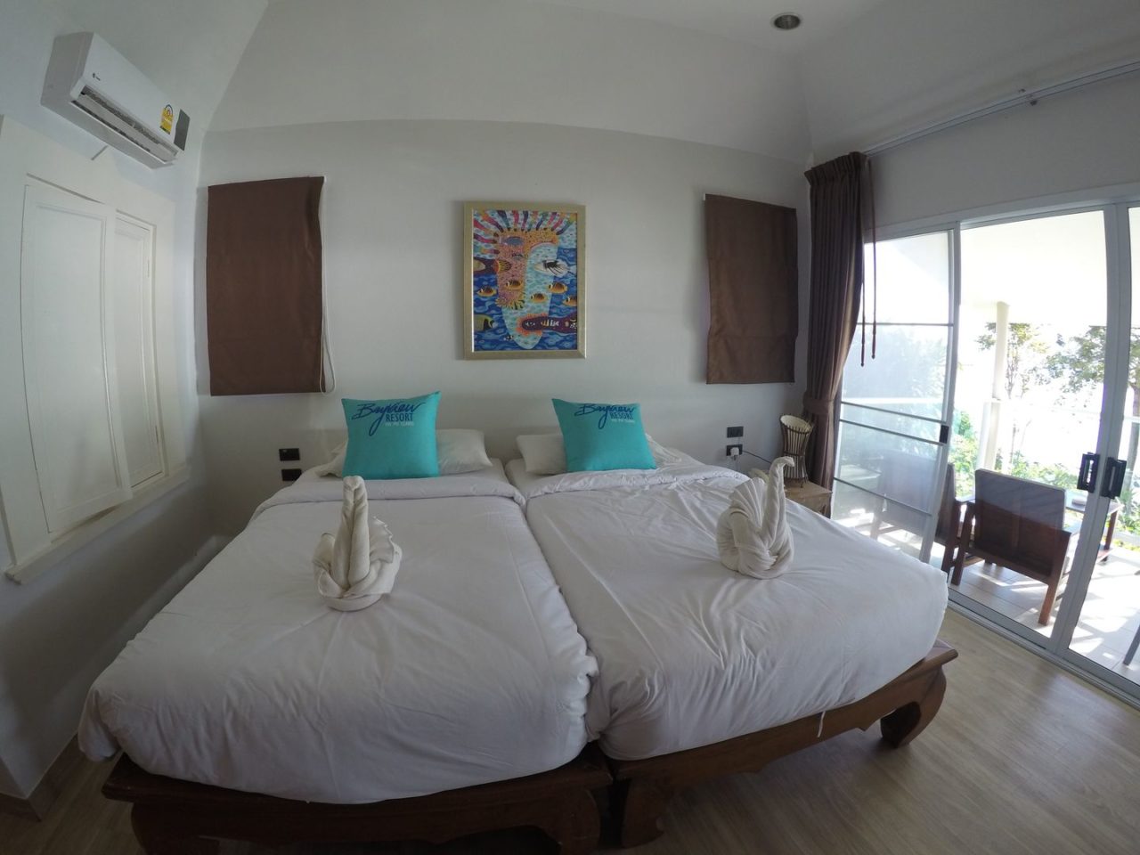 Já este ano, como gosto de experimentar lugares novos, escolhemos o Bay View Resort, também na praia de Tonsai. Havia reservado um quarto padrão com vista para o jardim e para as montanhas, mas quando cheguei lá, deparei com um quarto no alto do morro fedendo a mofo, com vista pra coisa alguma rs. Imediatamente fui na recepção e troquei de quarto e como o hotel estava cheio, nossa única opção foi um bangalô de frente pro mar. Aí sim, era perfeito! O quarto era ótimo, tinha varandinha com espreguiçadeiras, ar condicionado, frigobar, tv, uma cama maravilhosa, enfim, tudo! Porém, meu desembolso também foi maior e saiu bem mais caro…