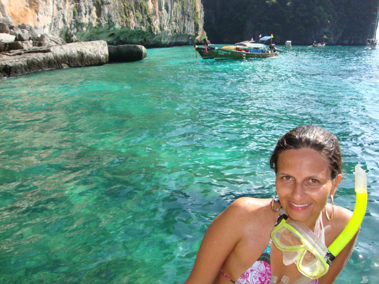 Maya Bay é um capítulo à parte: uma baía, ou melhor dizendo, uma praia escondida entre duas aglomerações rochosas, no meio do oceano…O lugar é lindo, mas perde um pouco do encanto com a horda de turistas e barcos de passeio que desembarcam lá, todos os dias. Em 2010 já era assim, mas ainda era controlável. Agora a coisa tornou-se insuportável! Você não consegue uma foto sozinha. Cheguei lá às 8h da manhã num long tail boat privado e a praia já tinha gente saindo pelo ladrão!! Uma coisa absurda e triste…