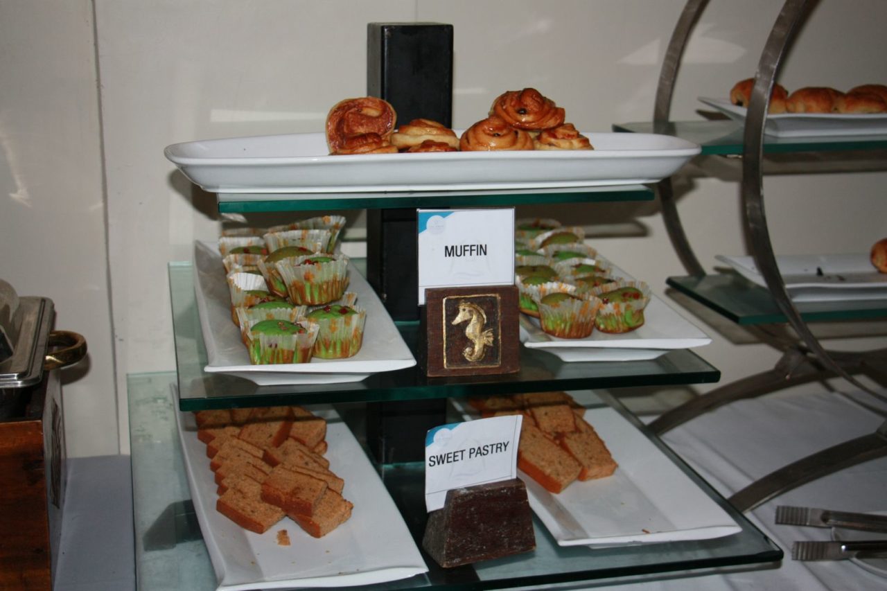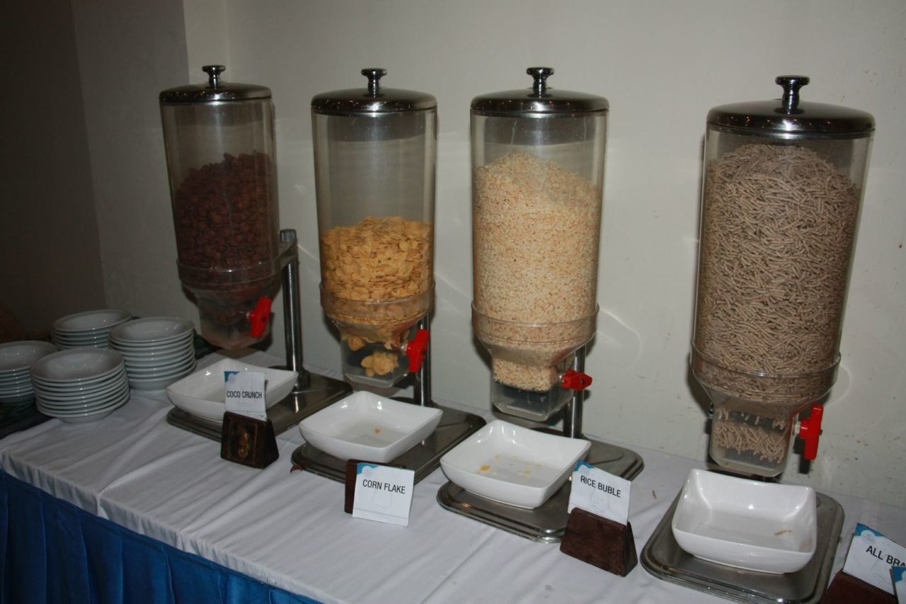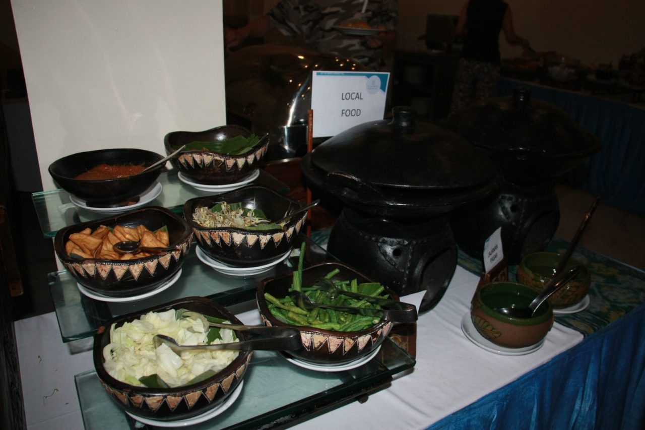 O café da manhã do Vila Ombak é estilo buffet, servido diariamente das 7:30 às11:00h e com diversas opções quentes e frias, estações asiáticas, frutas, omeletes, frios, bolos, croissants, etc.