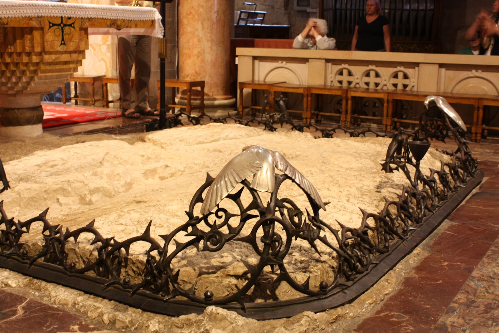 Uma escada majestosa desce para a cripta onde Maria foi enterrada e subiu aos céus. A igreja é uma espécie de caverna decorada por velas, que foi construída na época das cruzadas e que hoje está sob o comando das igrejas ortodoxas armênia e grega.