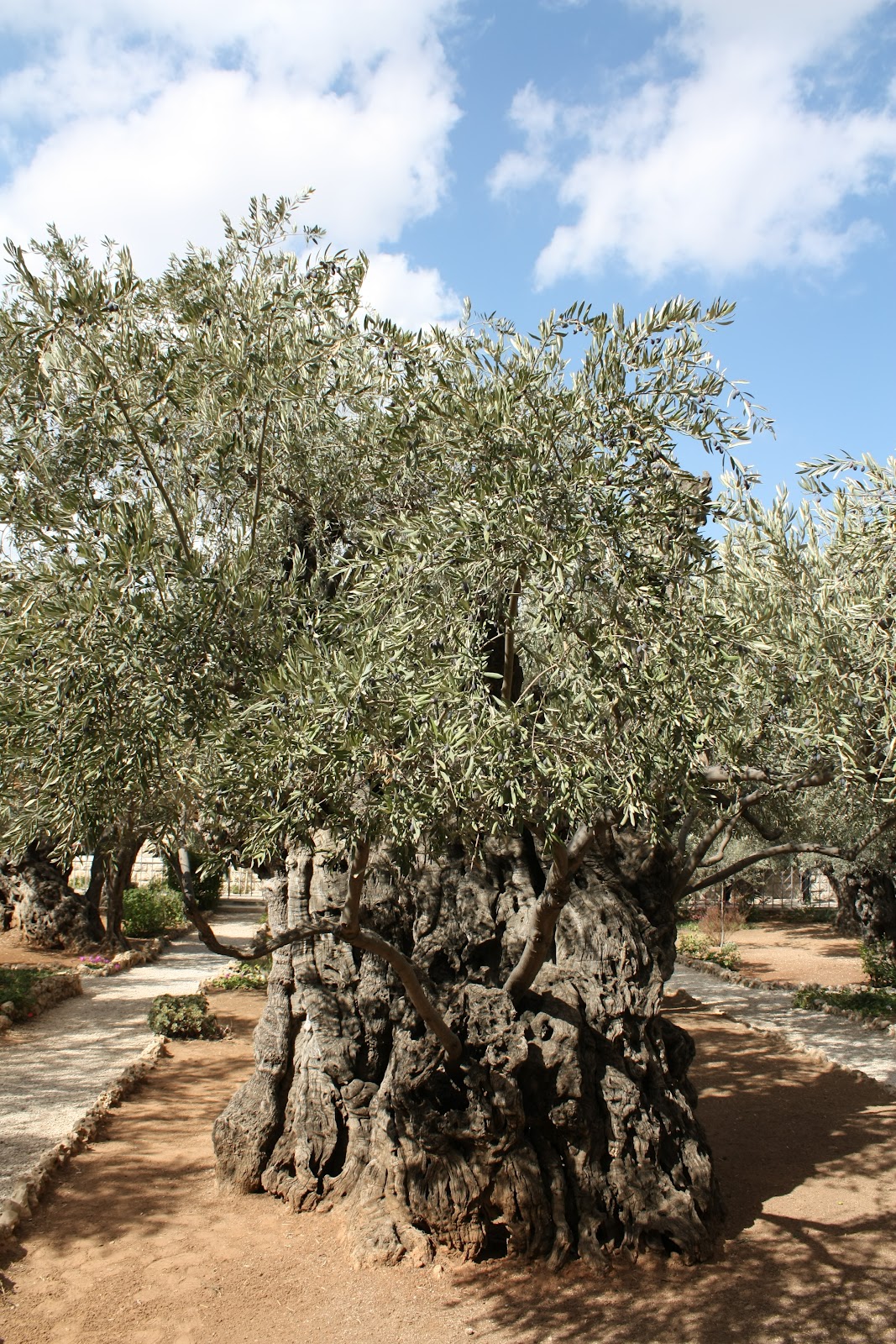 Neste Jardim, há 8 oliveiras antigas, que datam de mais de 2.000 anos. Quanto mais retorcidos seus troncos, mais velha é a oliveira. Essas árvores e seus frutos deram o nome a esse lugar, Gatsêmani: gat-shamna significa “prensa de azeitonas”em aramaico. Hoje, o azeite produzido por estas poucas oliveiras são usados pelo Papa, no Vaticano.
