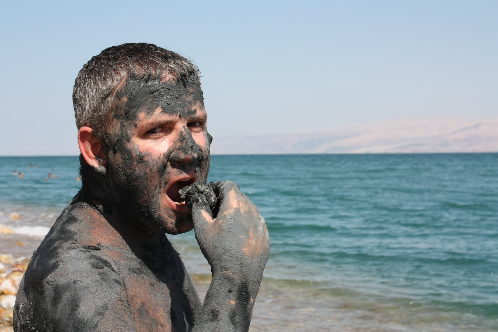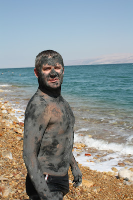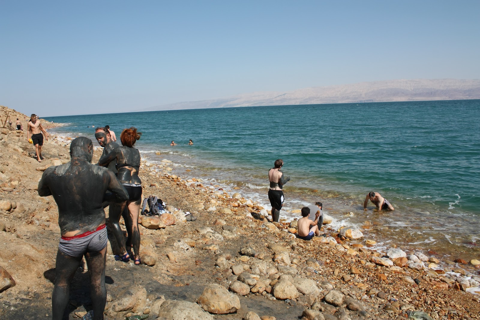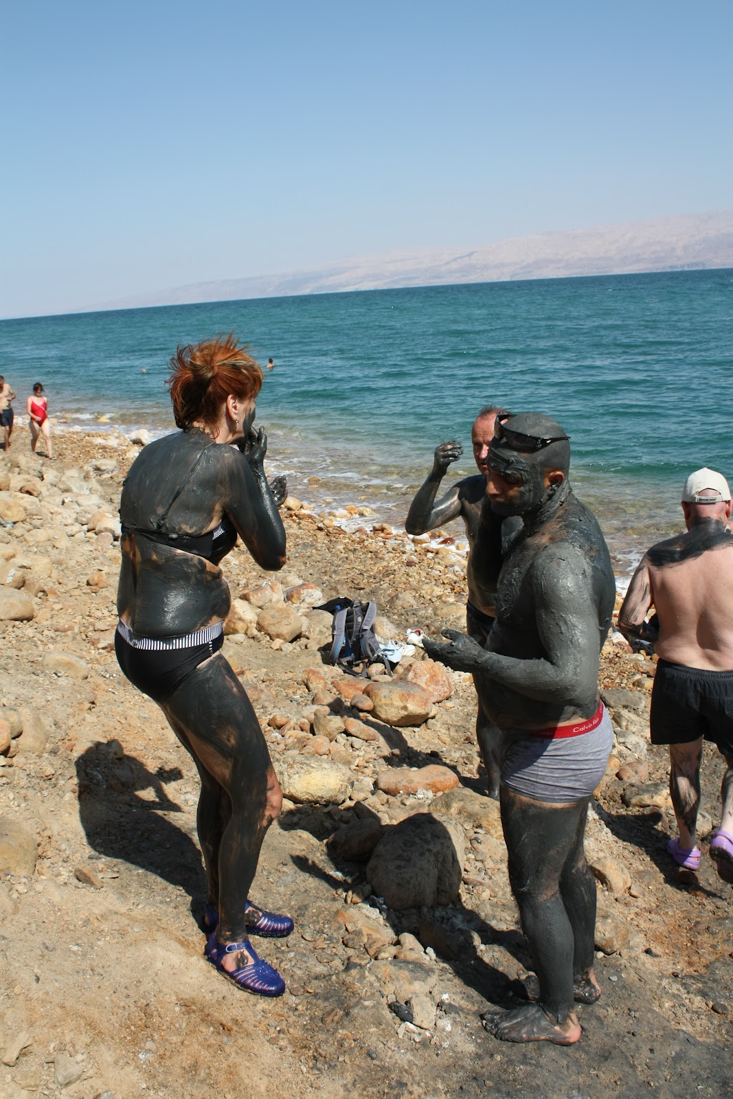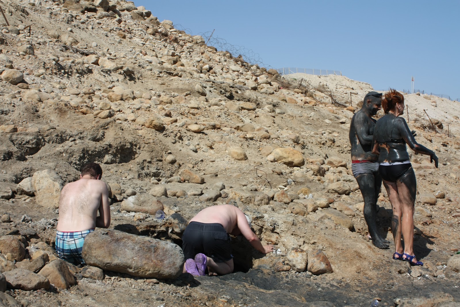 A segunda maior atração do passeio ao Mar Morto, depois do banho de mar, é o banho de lama medicinal, disponível naturalmente em pequenas fontes ao longo da margem. A gente enfia a mão na fonte da lama e se besunta toda! É uma delícia e você sai com a pele revigorada, novinha em folha! Um verdadeiro tratamento de beleza natural e totalmente free!