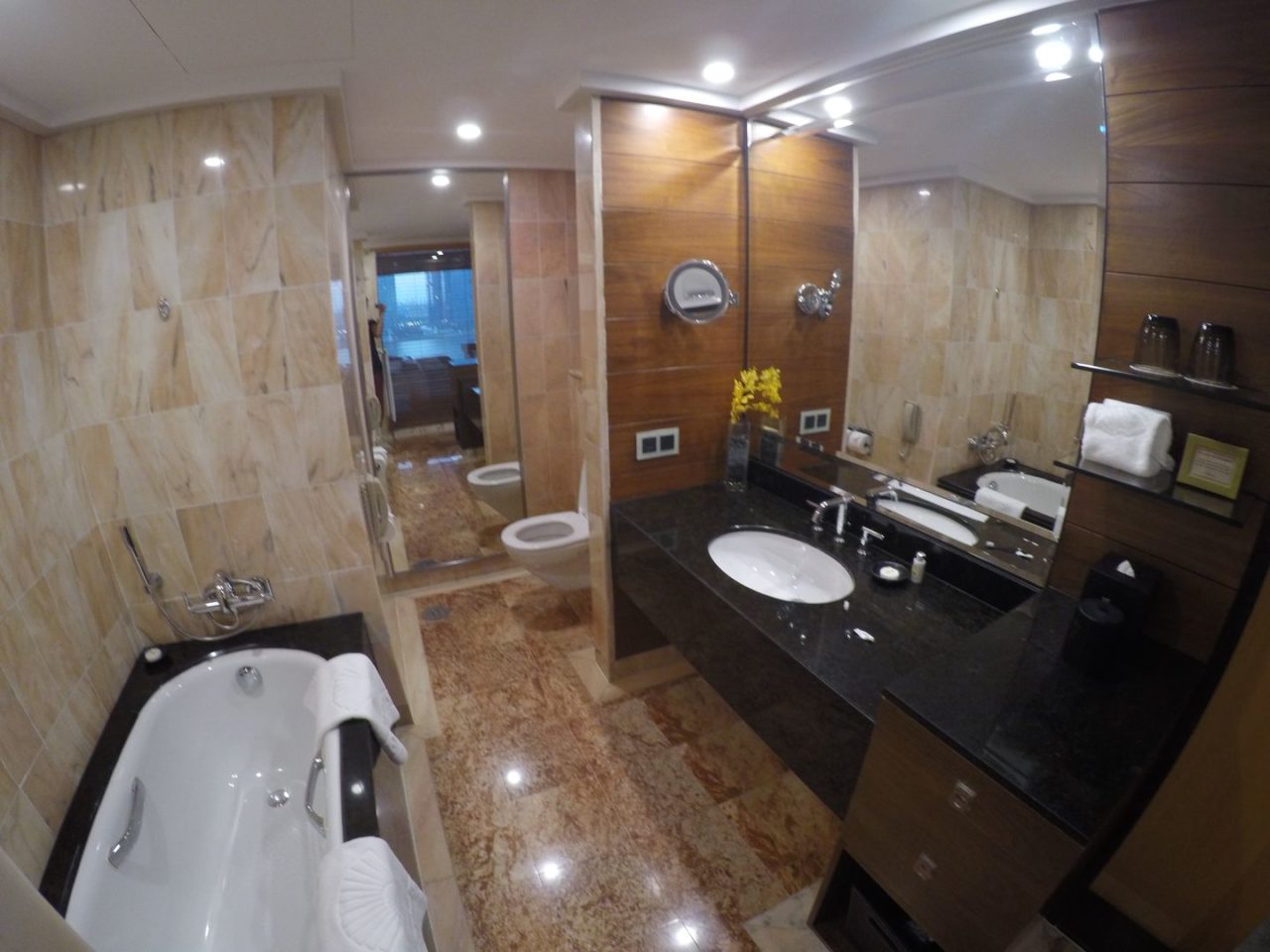 O saguão principal do hotel, onde estão os recepcionistas e concierge é lindo e luxuoso, com arranjos florais centrais, todo em mármore preto. No hall dos elevadores, o destaque vai pela beleza e dos gigantescos lustres de cristais, dando ainda mais requinte ao ambiente.
