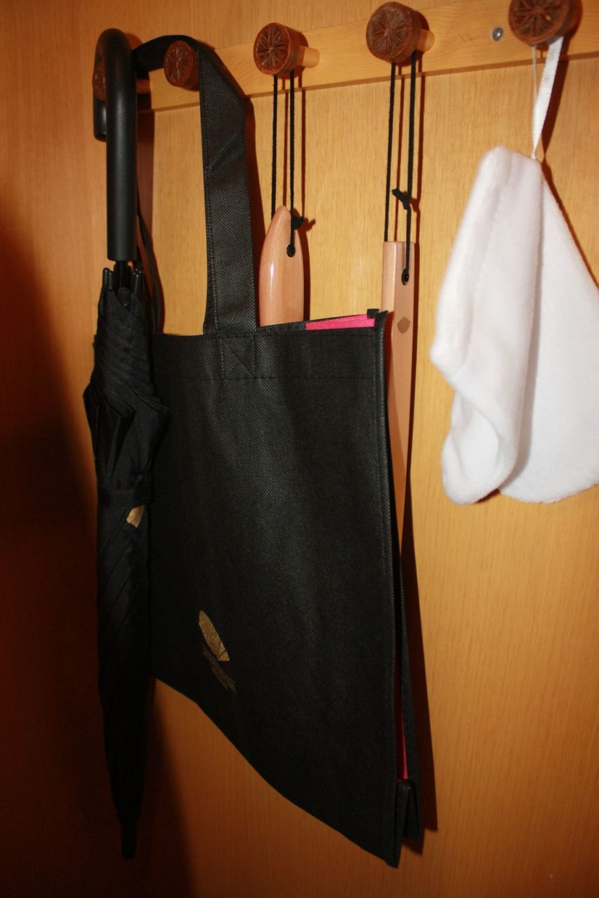 Além disso, o quarto conta com escrivaninha e um jogo de tomadas pra ninguém botar defeito, com todos os tipos de entradas para dispositivos eletrônicos. Acho isso o máximo! Só mesmo um hotel do padrão Mandarin Oriental poderia pensar nestes detalhes…