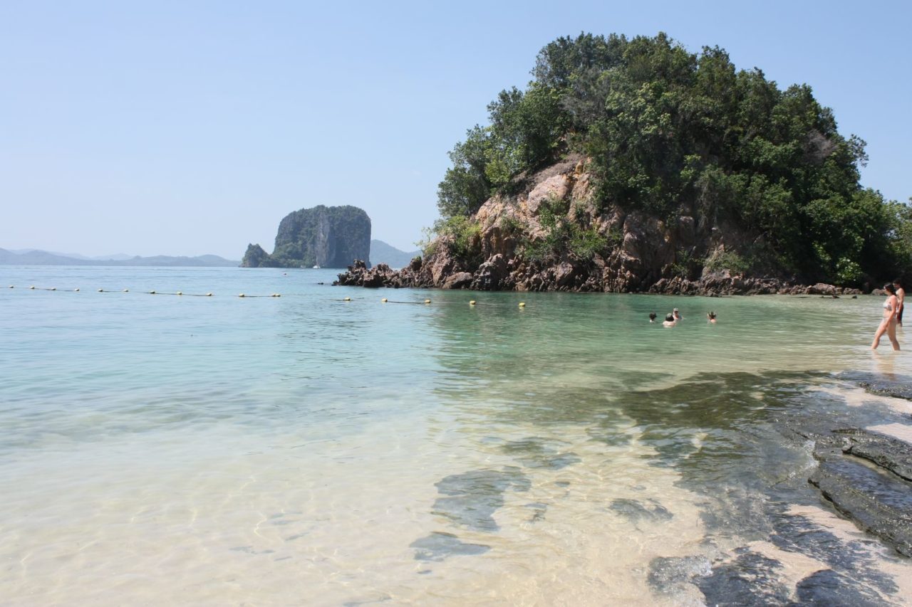 Nós saímos de Railay num speed boat às 9h e cerca de 30 minutos depois estávamos na primeira parada do passeio, a Koh Lao Lah Ding, ou Pradise Island, uma praia pequenininha de águas verdes esmeraldas, cercada por muito verde e com algumas cavernas, muito maravilhosa mas que infelizmente tinha metade dela tomada por barcos e a outra metade por chineses com seus coletes salva-vidas laranjas…aff!