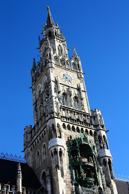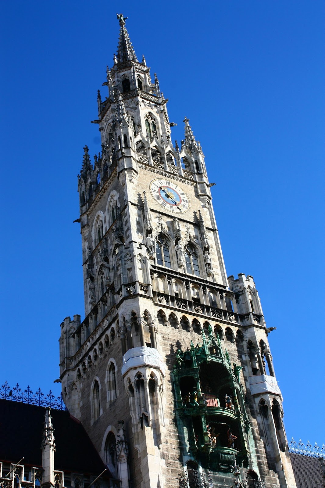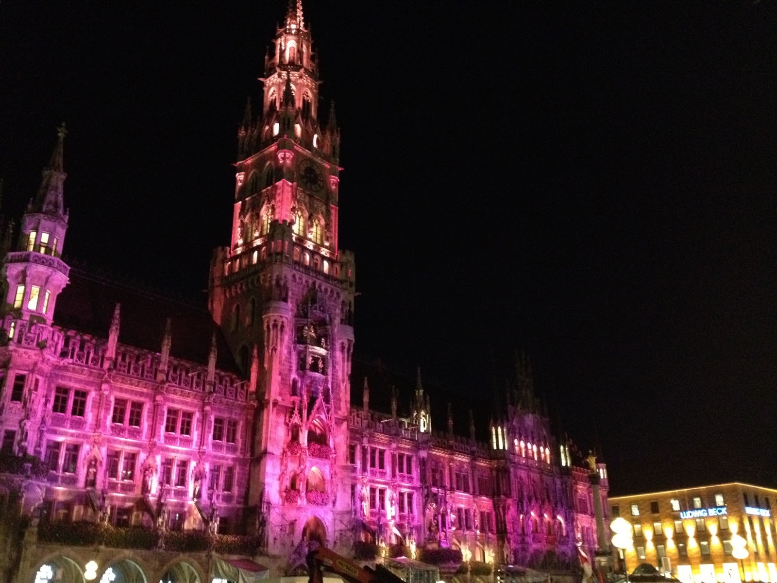 Não dá pra começar a falar da cidade sem falar da Marienplatz e a bela Neue Rathaus que nela impera, o prédio da prefeitura. Aqui é o coração da cidade, o centro de tudo e inclusive, foi pra lá que acabamos sendo “levados” pelo fluxo de turistas, mesmo que sem querer, na tarde em que chegamos, quando então fomos fazer reconhecimento de território. E quando vi aquele prédio enorme, imponente e todo iluminado por “50 tons de rosa”, fiquei encantada…Foi amor à primeira vista!