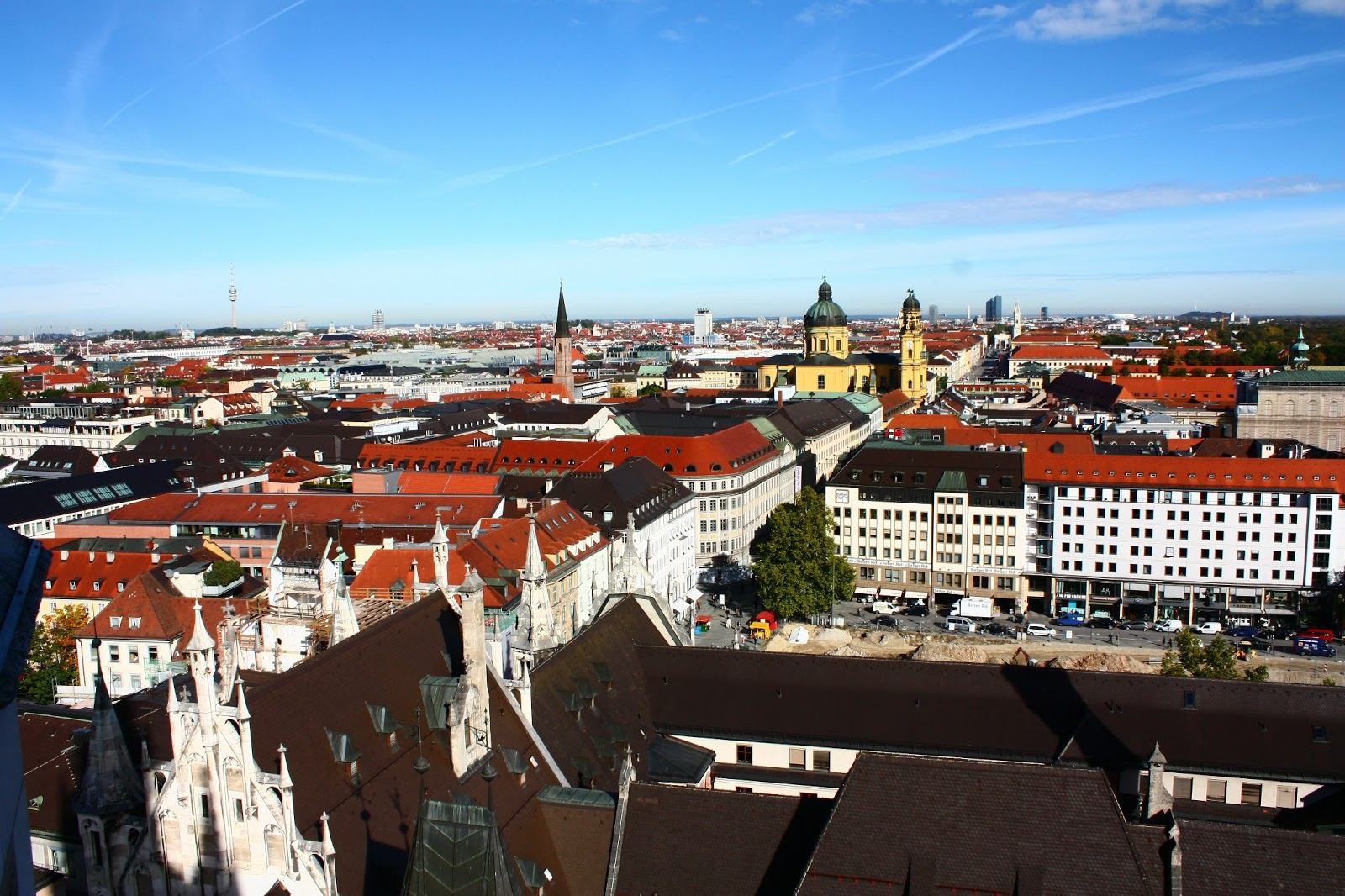 Vista da cidade de Munique do alto da Torre da Rathaus. À esquerda, o prédio do antigo Paço da Prefeitura. À direita, torre da igreja de São Pedro.