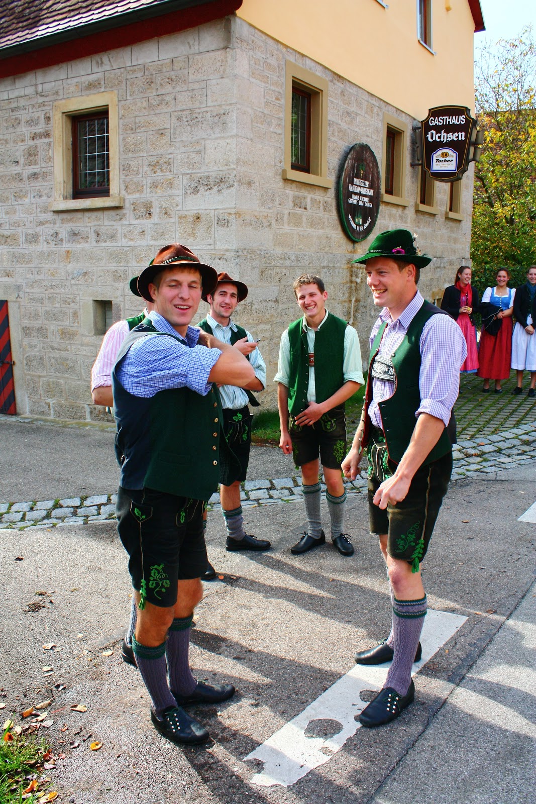 Saímos de Rothenburg no finalizinho da tarde e nossa próxima parada foi a lindinha cidade de Dinkelsbuhl. No caminho, alemães vestiam trajes típicos. Não resisti e paramos o carro para tirar uma foto!
