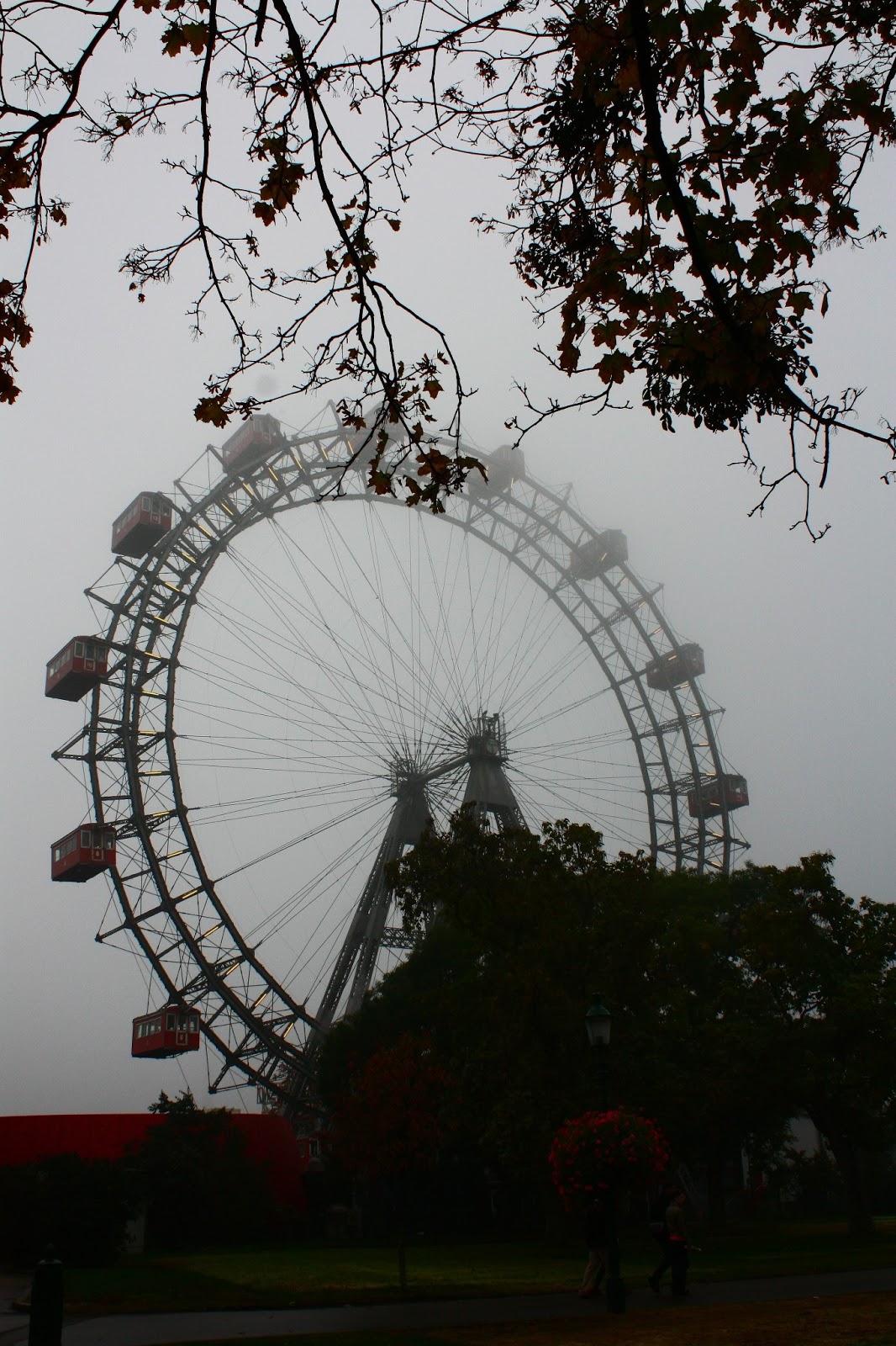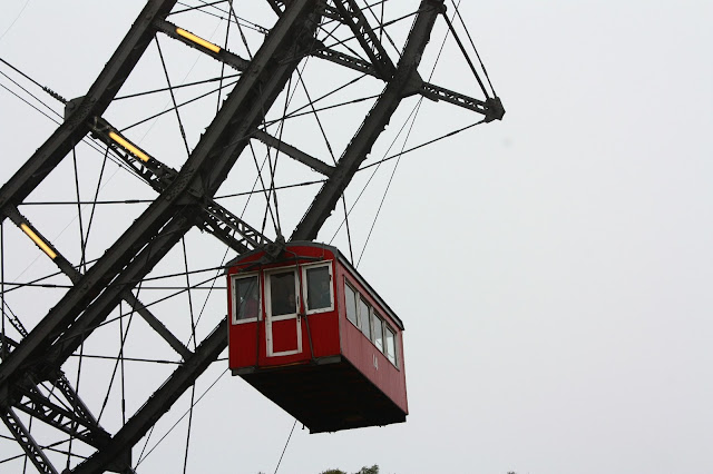 O charme desta roda são seus vagões vermelhos de madeira. O Parque Prater é enorme e tem muitos brinquedos, bem diferentes do que vemos por aqui. Mas tempo feio e chuva fina definitivamente não combinam com Parque de Diversões e, depois de algumas fotos, fomos embora do parque.