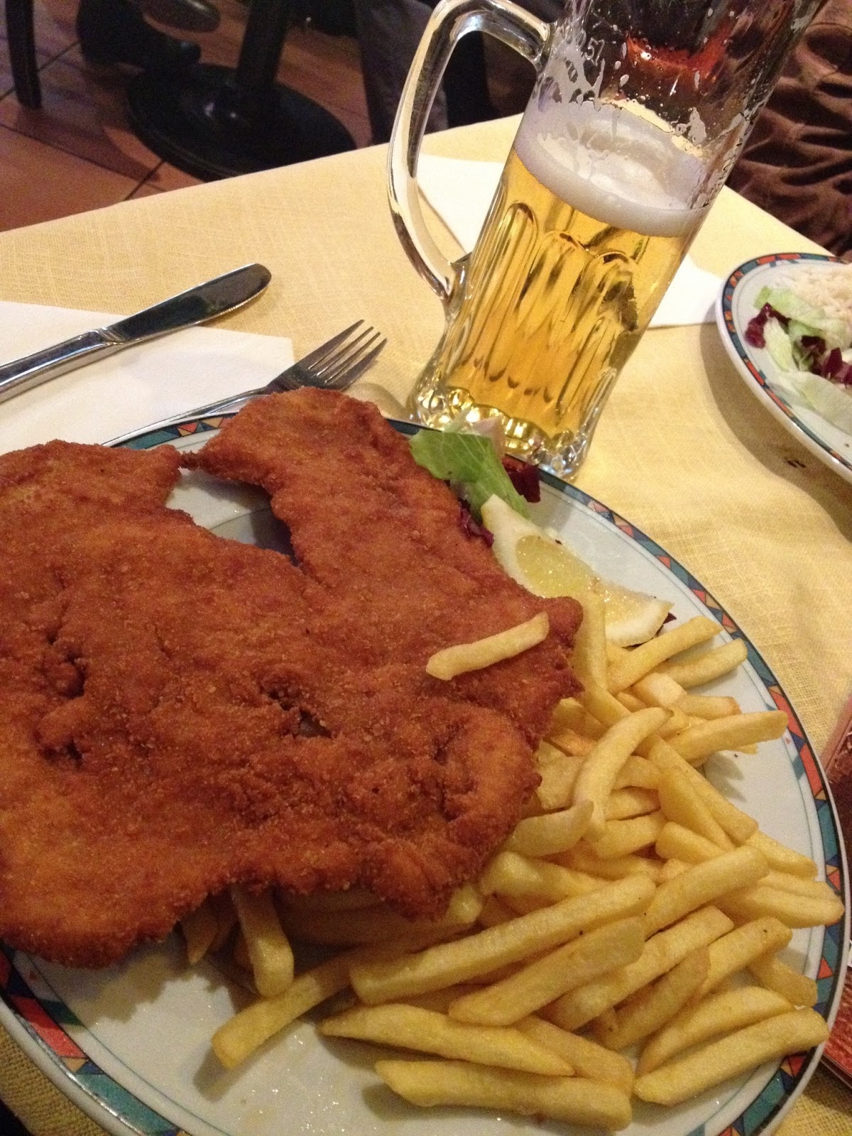 Já que estamos falando de comida, não dá pra ir embora de Viena sem comer o famoso Wienerschinitzel, o prato mais típico de toda a Áustria. Eu comi várias vezes e o melhor mesmo foi o que comi em Innsbruck. Em Viena, experimentei o do Sparky’s, mas não gostei tanto. Achei muito fino.
