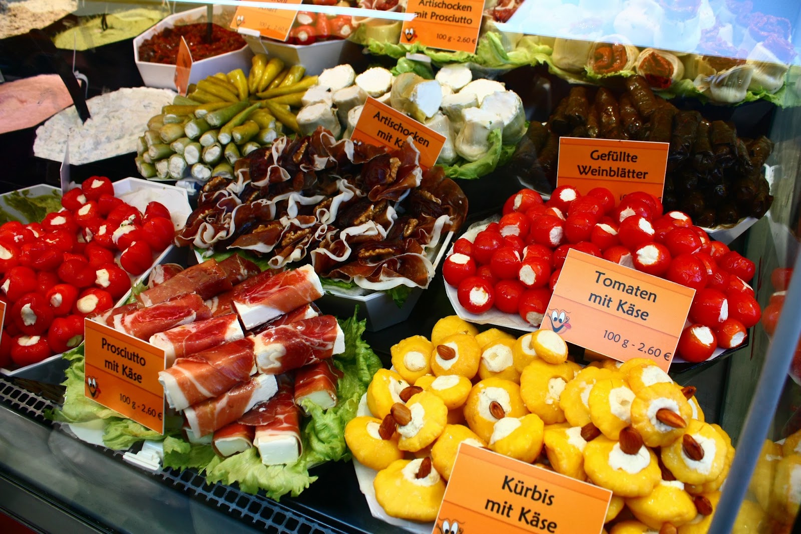 Uma grande surpresa em Viena foi o Naschmarkt, um mercado super tradicional de comidas, de altíssimo nível, por sinal, com especialidades culinárias do mundo todo! Há desde barraquinhas simples, vendendo azeitonas (algumas gigantes e de cores nada convencionais) e outros antepastos a refinados restaurantes, servindo champagne e caviar!