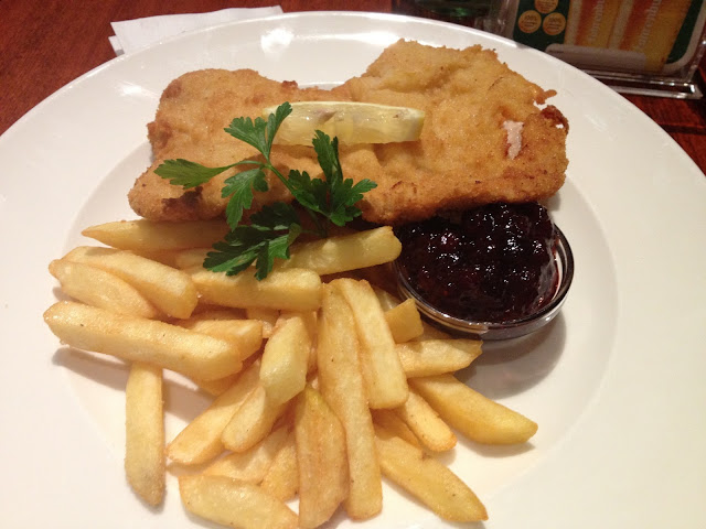 O Schinitzel é o prato típico na Áustria. O prato consiste em filé de carne de porco empanado, acompanhado de batata frita e uma geleia de frutas vermelhas, que dá um toque especial ao prato. Mas não foi todo schinitzel que comi que veio com esta geleia. Foi só o do restaurante Messino 1903, que ficava bem próximo ao nosso hotel. Outro ícone da culinária austríaca é a Sacher torte, mas que experimentei só em Viena e depois conto sobre.