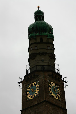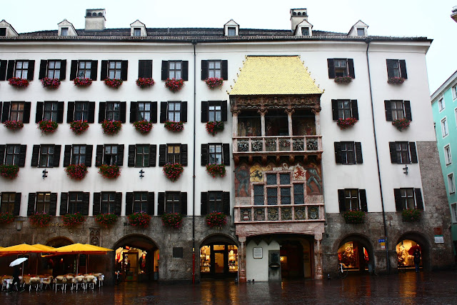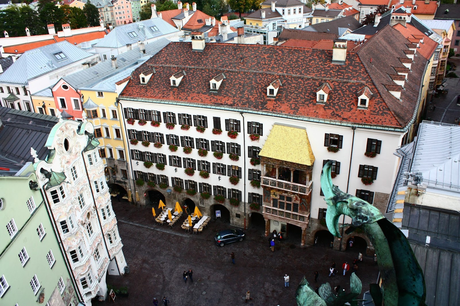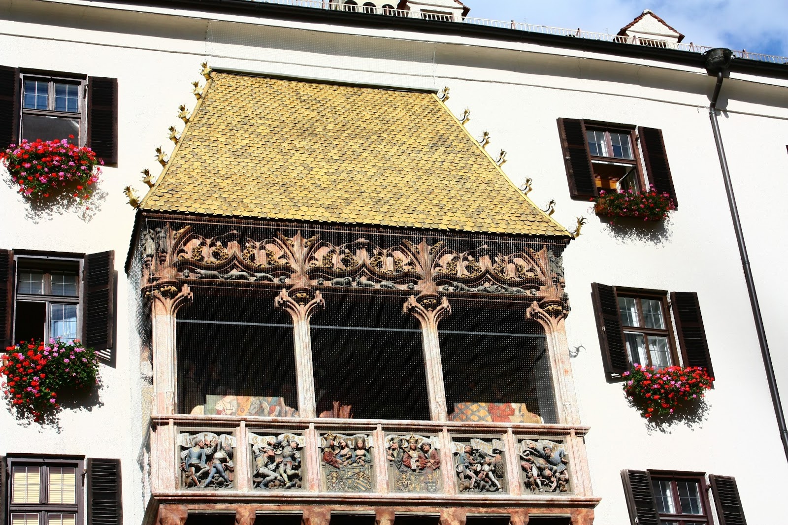 E a principal atração turística da cidade está bem ali, o chamado Golden Roof ou Telhadinho de Ouro, um conjunto de 3 sacadas do século XV, cobertas por um pequeno telhado formado por quase 3.000 ripas de cobre, que reluzem ao longe, principalmente em dias de sol! Foi construído pelo imperador Maximiliano I para abrigar os príncipes do estado do Tirol.