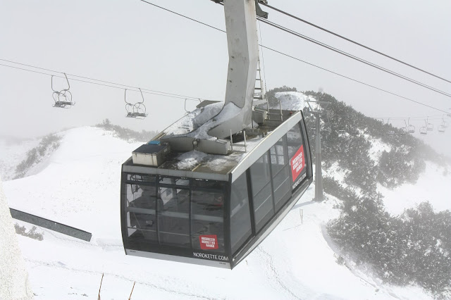 Para quem não está de carro, o acesso é feito por meio de um trem que sai do centrinho de Innsbruck, na estação do Congresso e vai até Hungerburg (é coisa de minutinhos). Pra quem está de carro, como era o nosso caso, o melhor é ir direto até Hungerburg por uma única razão: o estacionamento lá é grátis e já no centro, estacionar o carro vai custar alguns bons euros. Em Hungenburg compramos o ingresso por 23 euros euros, que dá acesso ao Hafelekar, no topo! O rapaz nos disse que a temperatura no topo era de -2 graus Celsius, o que não era nenhum absurdo. Nos encapotamos todos de roupa térmica e um zilhão de blusas, casacos, luvas, gorros, etc, etc. O trajeto é feito em duas etapas: primeiro, um teleférico até Seegrube, a 1905m de altitude. Depois, um outro teleférico até o Hafelekar, no topo da montanha, a 2256 m de altitude. Ambos têm restaurante. Quem preferir, pode arriscar as muitas trilhas na neve que partem de ambos os pontos!