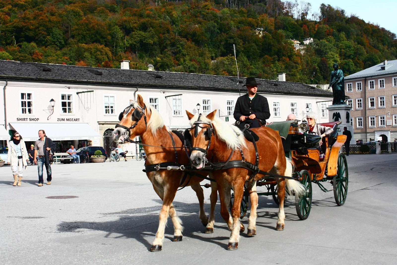 Continuando pro esta charmosa rua, chegamos `a Dom Platz, uma ampla paça onde está o Palácio Residenz e a Catedral de Salzburg. Por aqui, carruagens charmosas dão um charme ainda maior a esta bela cidade austríaca!