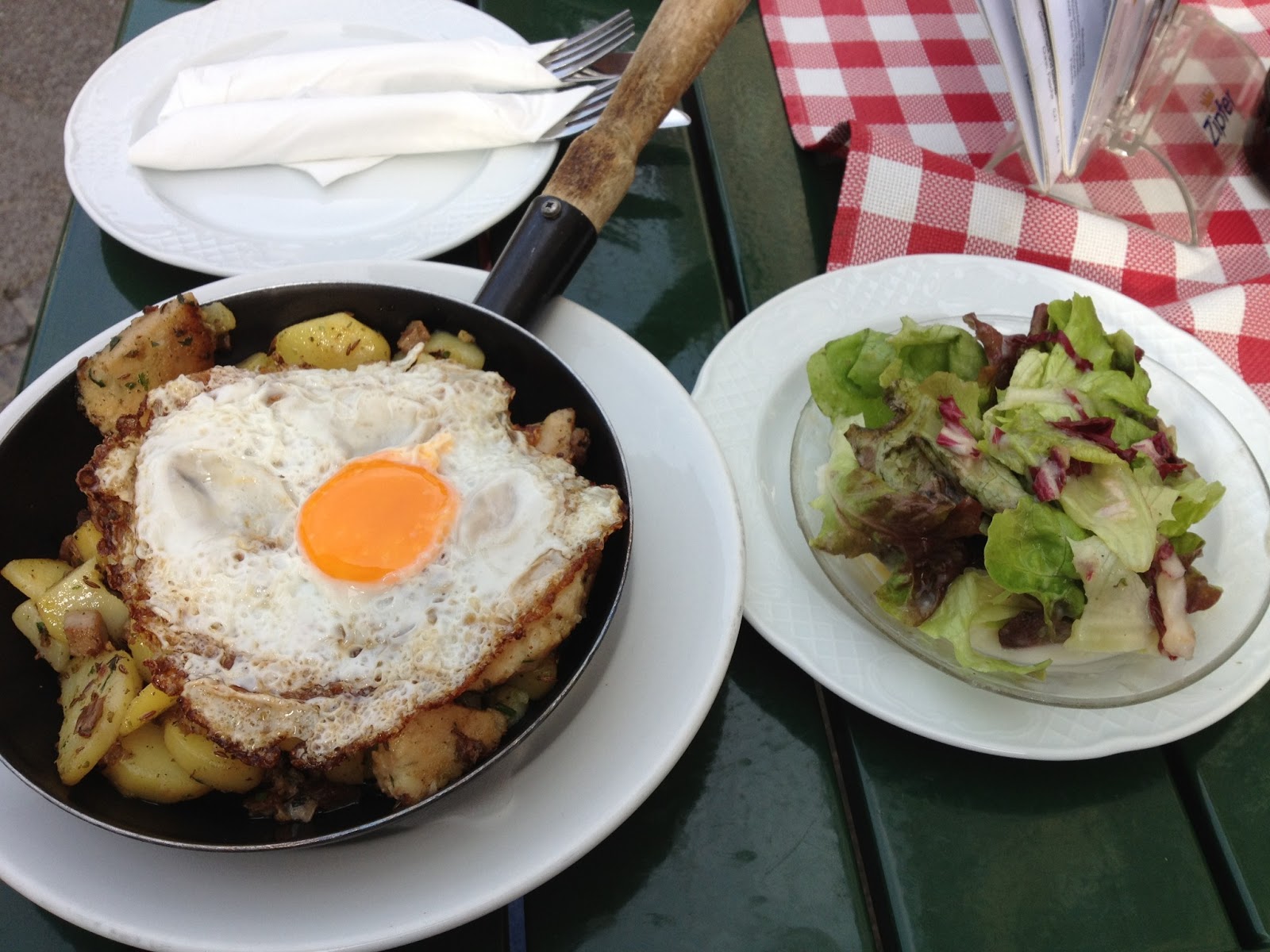 Fazia bastante calor para aquela época do ano e almoçamos ao ar livre. Eu estava morrendo de fome e pedi algo que me desse bastante “sustância” e, de repente, a comida chega direto na panela, ou melhor, na frigideira “uma mistura de batatas e carnes, com um belo ovo frito em cima! Foi estranho, porque a gente comia direto na frigideira, mas estava uma delícia!
