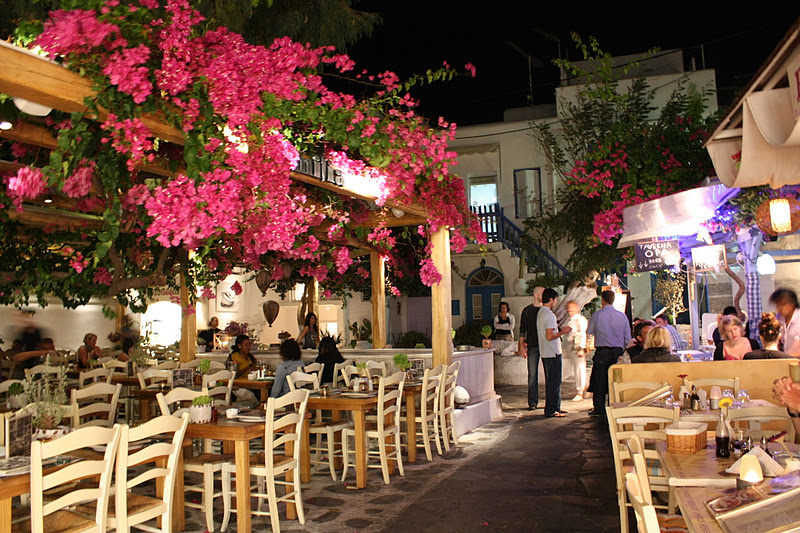 Mas ainda tínhamos que sair à noite para jantar. Acabei achando um lugar lindo, que tinha visto inclusive foto na internet, mas achei por acaso, me enfiando naquelas ruas. No lugar tem 3 tavernas numa área aberta, uma do lado da outra, que são uma graça porque o lugar é cheio de bougainvilles…Escolhemos a Passagio, onde comemos uma bela bisteca de porco com batatas e saladas. Tomamos uma cervejinha e comi como uma rainha rsrs. Depois fomos andar por Chora `a noite e fomos descansar…