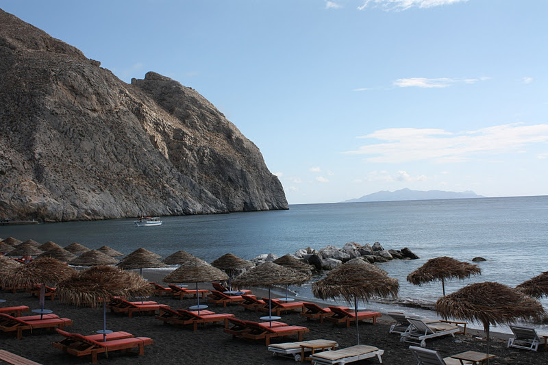 Fomos primeiro em Perissa. Como era cedo, a praia estava bem vazia, com os bares e restaurantes começando a abrir. A praia é bonita, mas como toda praia de Santorini, tem a “areia” escura, originária de micropedrinhas de formação vulcânica. A água, apesar de ser bem clara, não se mostra desta forma devido ao fundo escuro.