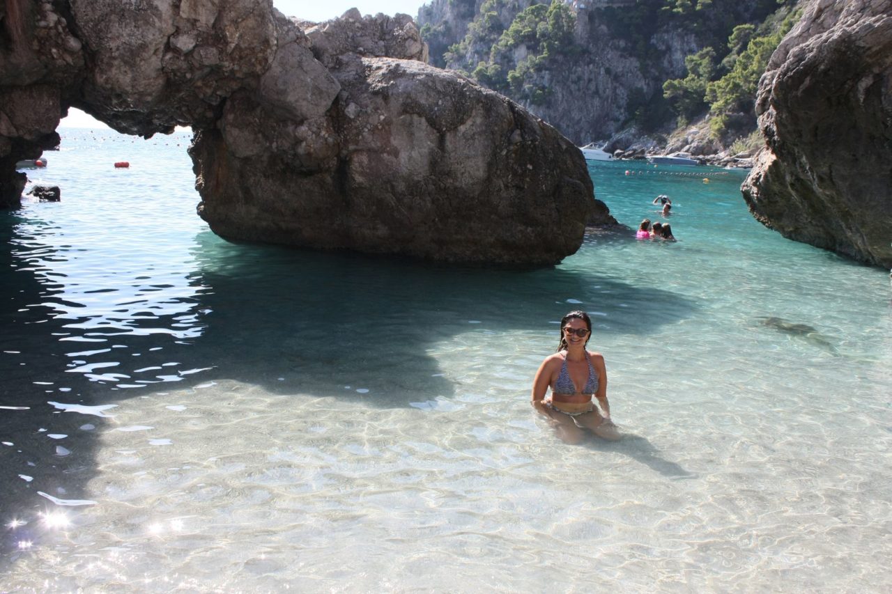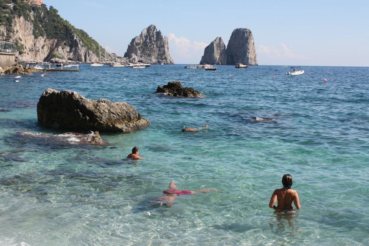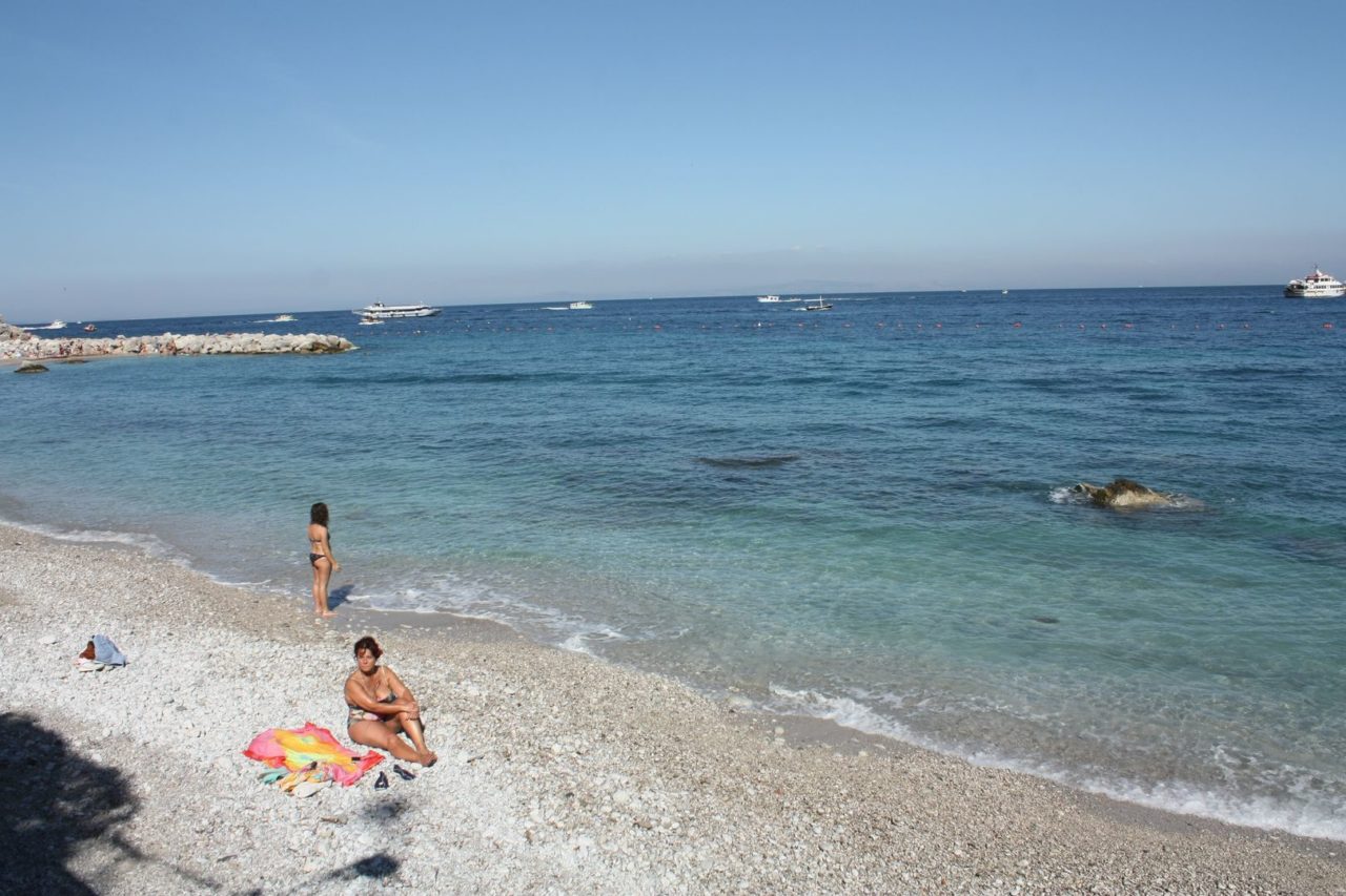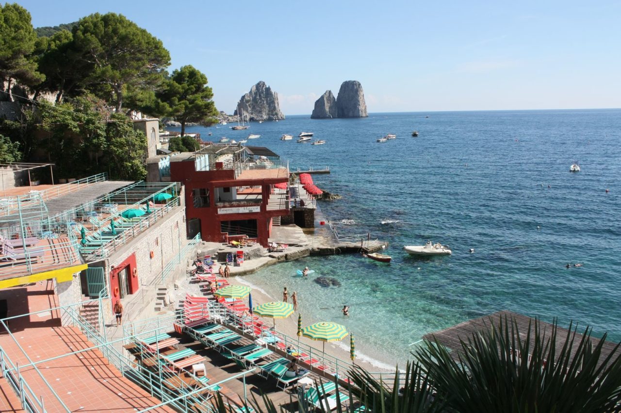 Definitivamente Capri não é um destino de praia. A grande maioria delas são exclusivas de algum beach club, mas ainda assim dá pra curtir uma praia sem ter que pagar nada. Eu me surpreendi em Marina Piccolla. A praia era linda e com uma vista incrível dos farigliones. Ao redor alguns restaurantes onde comprávamos bebida e alguns snacks pra levar pra areia.