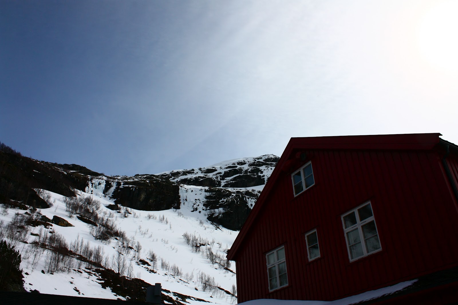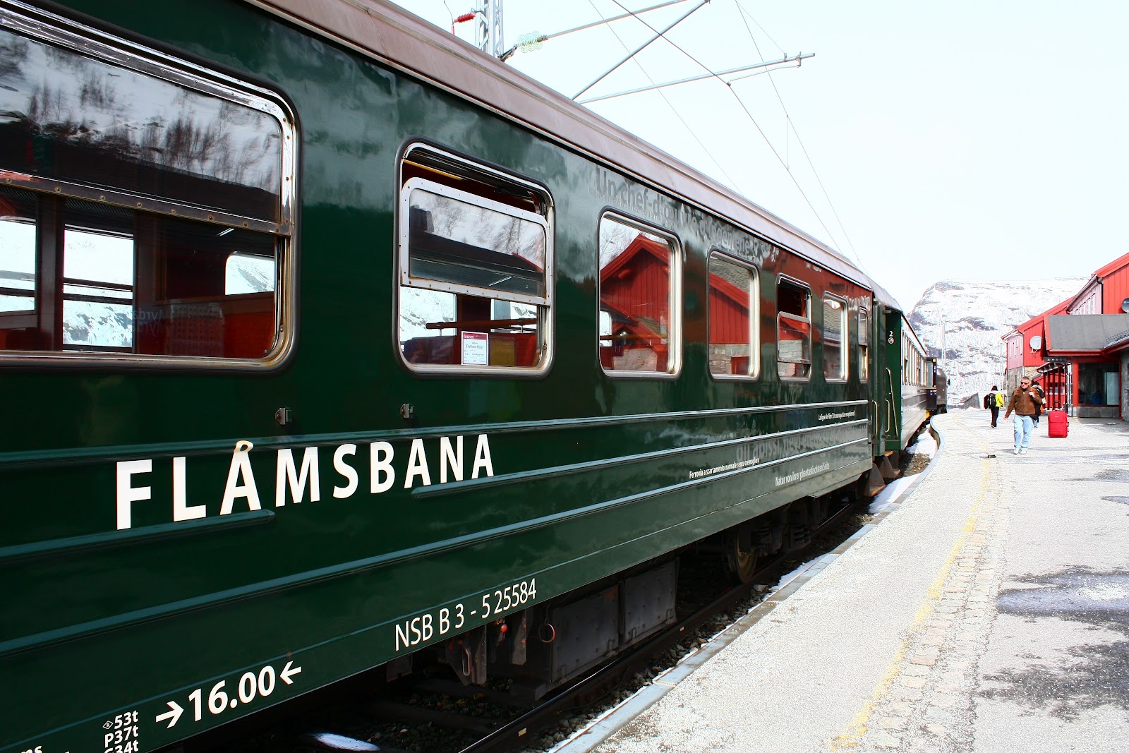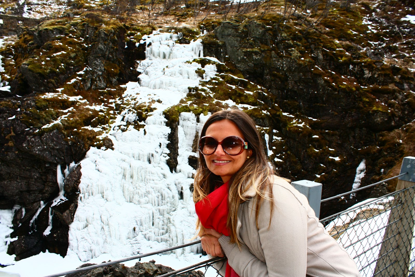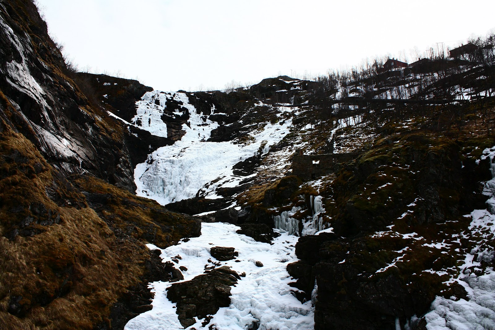 A ferrovia Flamsbana foi escavada `a mão pelos noruegueses de 1924 a 1940, para justamente ligar a região dos Fjordes ao resto do mundo. A estação é no meio do nada, como quase tudo que vimos por ali. Difícil acreditar como este povo vive no meio do frio, do gelo, sem nada ao redor. O trecho que liga Myrdal a Flam tem apenas 20 km mas devido às suas muitas curvas e alto grau de inclinação, faz a viagem durar cerca de 1 hora, com direito a parada para fotos na bela cachoeira Kajosfossen, que nesta época (primavera) estava totalmente congelada! Fantástica!!!
