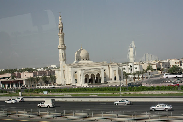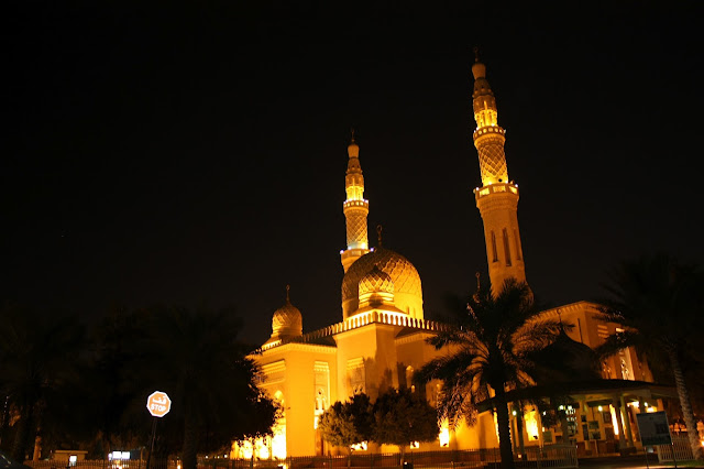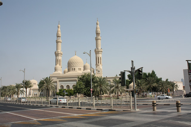 Em frente à praia se encontra a Jumeirah Mosque, a única mesquita de Dubai aberta a não muçulmanos, mas infelizmente não pudemos entrar, pois além de não estamos apropriadamente vestidos (todos devem cobrir pernas e as mulheres também braços e o cabelo), já havia passado o horário das visitas e sabíamos disso. Para conhecê-la, há excursões organizadas pelo Sheikh Mohamed Centre todos os domingos, terças, quintas e sábados, às 10:00h e os visitantes podem trazer sua câmera, pois é permitido tirar fotos em seu interior. Pensamos até em fazer o tour em outro dia, mas acabamos desistindo só de pensar em ter que vestir uma calça jeans naquele calor dos #*M+@(!~