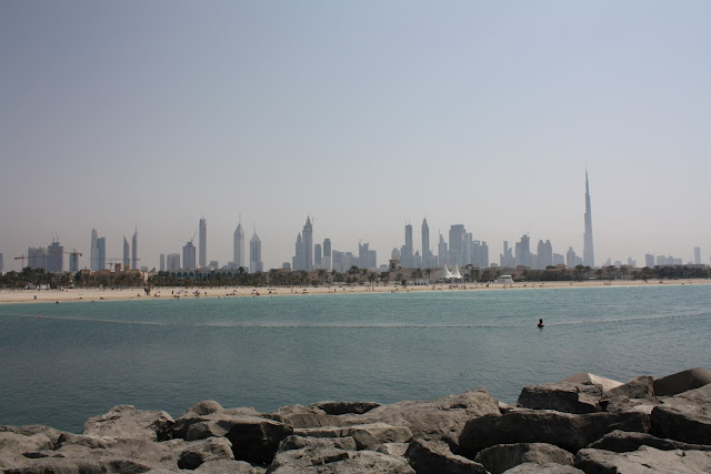 Pedimos ao nosso taxista pra seguir adiante e nos deixar na praia ao lado do Burj, de onde teríamos uma linda vista lateral do mesmo para tirarmos fotos, mas ele andou tanto, mas tanto, que o Al Arab sumiu da paisagem dando lugar ao Khalifa. Nós percebemos que ele estava andando mais do que devia, mas como ele não estava fazendo o percurso pela praia, não sabia nem onde estávamos e ficávamos na esperança dele fazer algum contorno que nos levasse ao Burj. Conclusão: as fotos tiveram que ficar pro dia seguinte, mas mesmo assim descemos por ali para fotografar e ver o que tinha na praia de Jumeirah.
