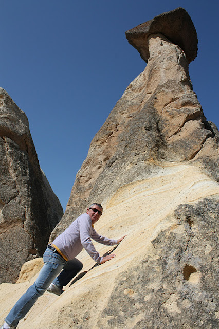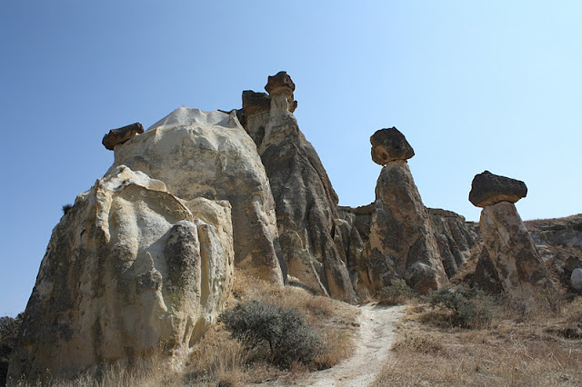 As esculturas naturais na Capadócia foram se formando ao longo do tempo moldando a pedra vulcânica arenosa. Rios, chuvas, tempestades de neves e ventos fortes modificaram a paisagem e criaram fantásticas formações rochosas. Os monumentos são como cogumelos e castelos construídos numa paisagem lunar” (blogdoturismo).