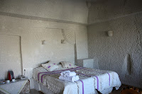 Do ponto de ônibus da cidade, procuramos informação sobre nosso hotel e lá fomos nós pela cidade, arrastando nossas malas num pequeno morro, até chegarmos no Village Cave Hotel. O hotel é uma graça, estilo caverna mesmo, como a maioria dos hotéis de Goreme. O rapaz da recepção foi muito simpático e nos emprestou um quarto para nos ajeitarmos, até que o nosso ficasse pronto.