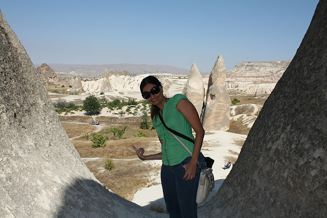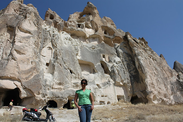 Na volta de Avanos para Goreme, nossa moto parou de funcionar do nada, em plena estrada. E agora?? De repente, passa uma outra moto e para. Era um simpático turco oferecendo ajuda. Ele pegou o celular e ligou pro telefone celular do cara da locadora. Ninguém atendeu. Aí ligou na própria empresa, mas caiu na cidade de Kayseri, bem mais longe. O jeito foi eu montar na garupa da moto dele e ir até Goreme buscar ajuda na locadora (hilário ver eu na garupa de um desconhecido, no meio da Turquia). Aí o cara começou a andar tão devagar que comecei a ficar com medo. De repente, o Alessandro passa por nós na moto voando. Tinha feito ela funcionar! Ufa! Desci da moto do rapaz e voltei pra do meu maridinho e fomos direto na locadora trocar a moto pra não passar outro sufoco!