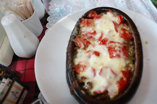 De entrada, um pão gigante com berinjelas ao molho de tomate e iogurte, muito bons! Depois comemos um delicioso carneiro ao forno com molho de tomate e mussarela e frango ao curry com tomates e pimentões e arroz. Estava tudo uma delícia e ficou em 30 TL.