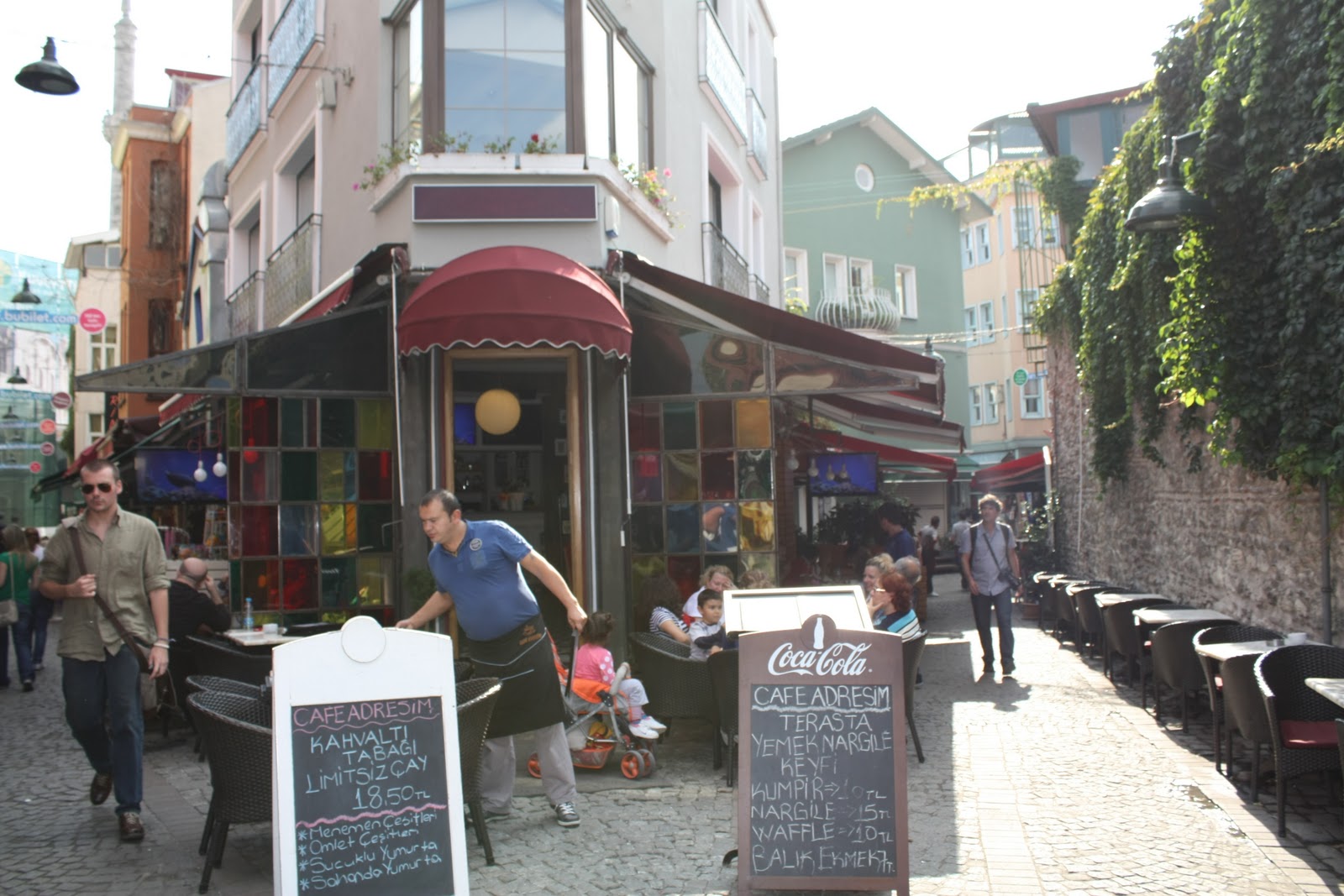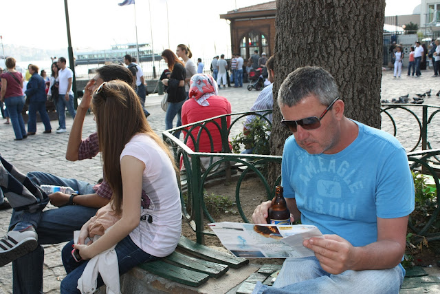 Em seguida, tomamos um táxi até a Taksim Square e fomos curtir o bairro de Beyoglu, desta  vez, com mais calma que no dia anterior. Fomos caminhando por toda a Istiklal Caddesi, apreciando o vai e vém de turcos e turistas na rua mais peatonal de Istanbul. Depois, fomos procurar os points da rua, como a Ciçek Pasaji (Passagem das Flores), o Balik Pazari (Mercado de Peixes) e Nevizade Sokak. A primeira é uma espécie passagem coberta que conecta a Istiklal ao Balik, com restaurantes mais formais. Já no Balik Pazari, além de peixes (o cheiro não é muito forte) há também quitandas e barzinhos, mas é na Nevizade que há uma profusão destes, além de restaurantes e meyhanes (restaurantes que vendem as famosas mezes, entradinhas típicas turcas, que são deliciosas, por sinal). O movimento e a animação era constante e não era porque era domingo, pois afinal, o descanso dos muçulmanos é na sexta-feira e domingo era um dia comum, como uma terça-feira pra nós.